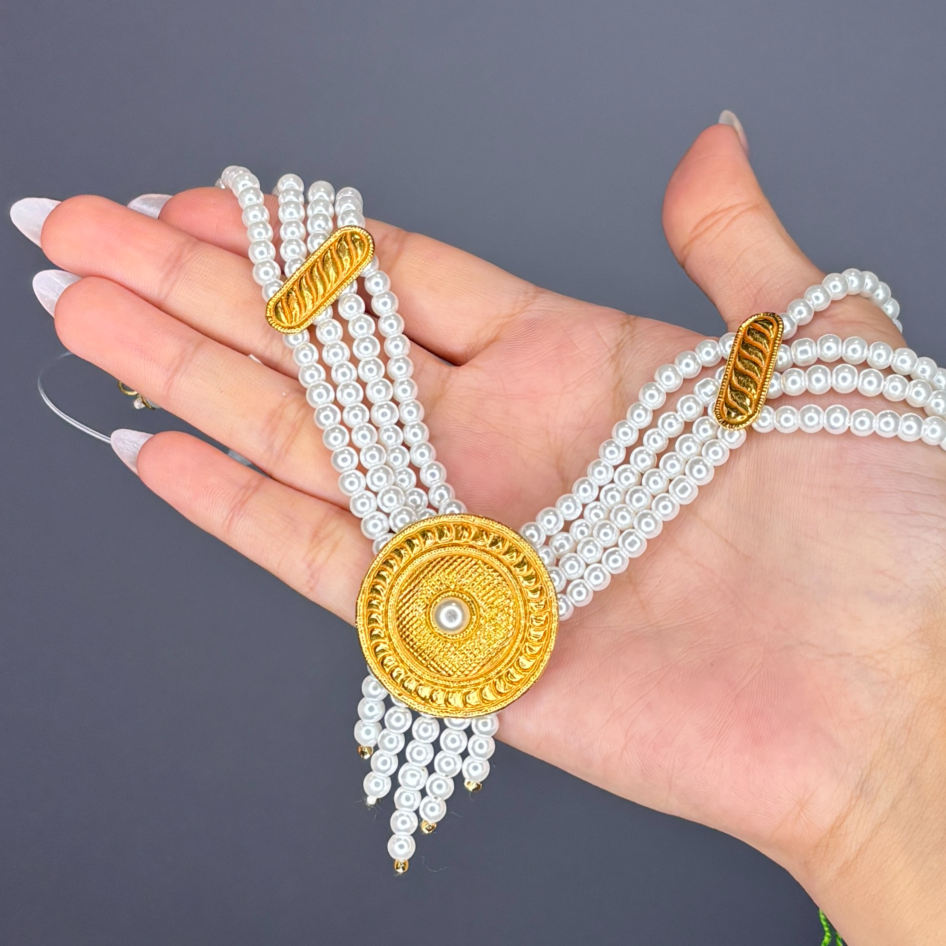 This is a close-up of a vibrant traditional joolry item, it has high-purity 24 KT gold for its metal elements. The piece features a decorative drop made of sparkling WHITE faceted beads. It is a single, ornate traditional piece.