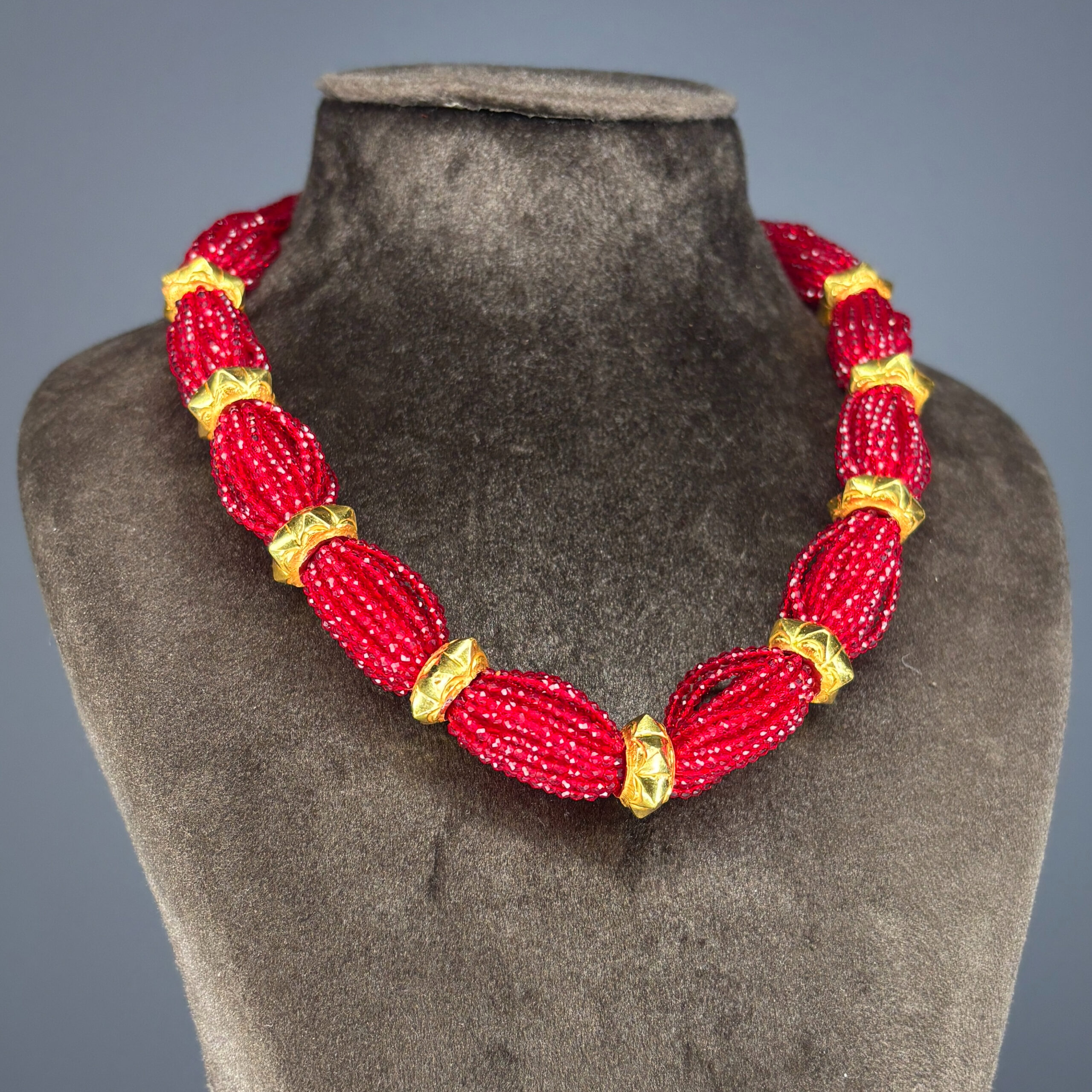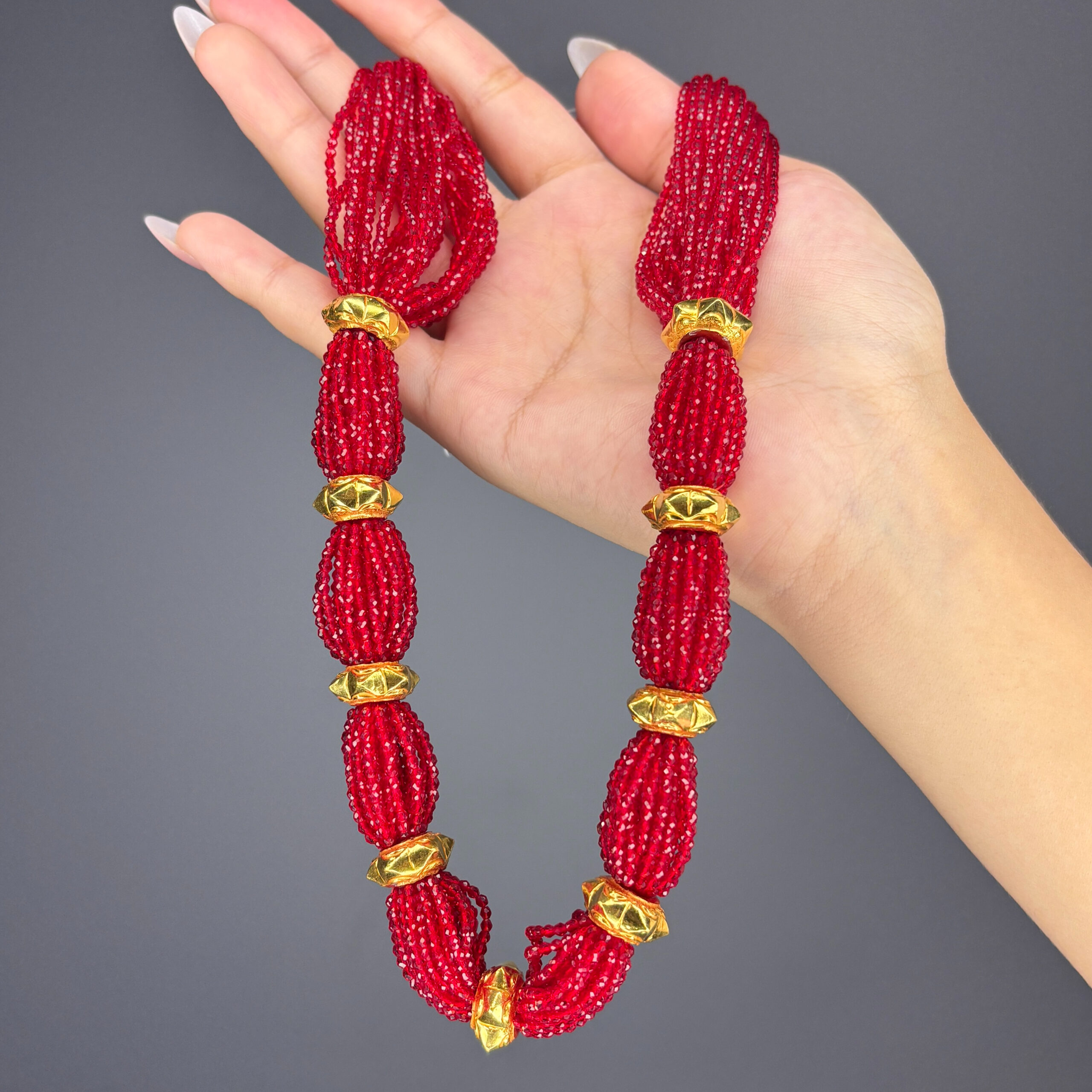 This is a close-up of a vibrant traditional joolry item, it has high-purity 24 KT gold for its metal elements. The piece features a decorative drop made of sparkling red faceted beads. It is a single, ornate traditional piece.