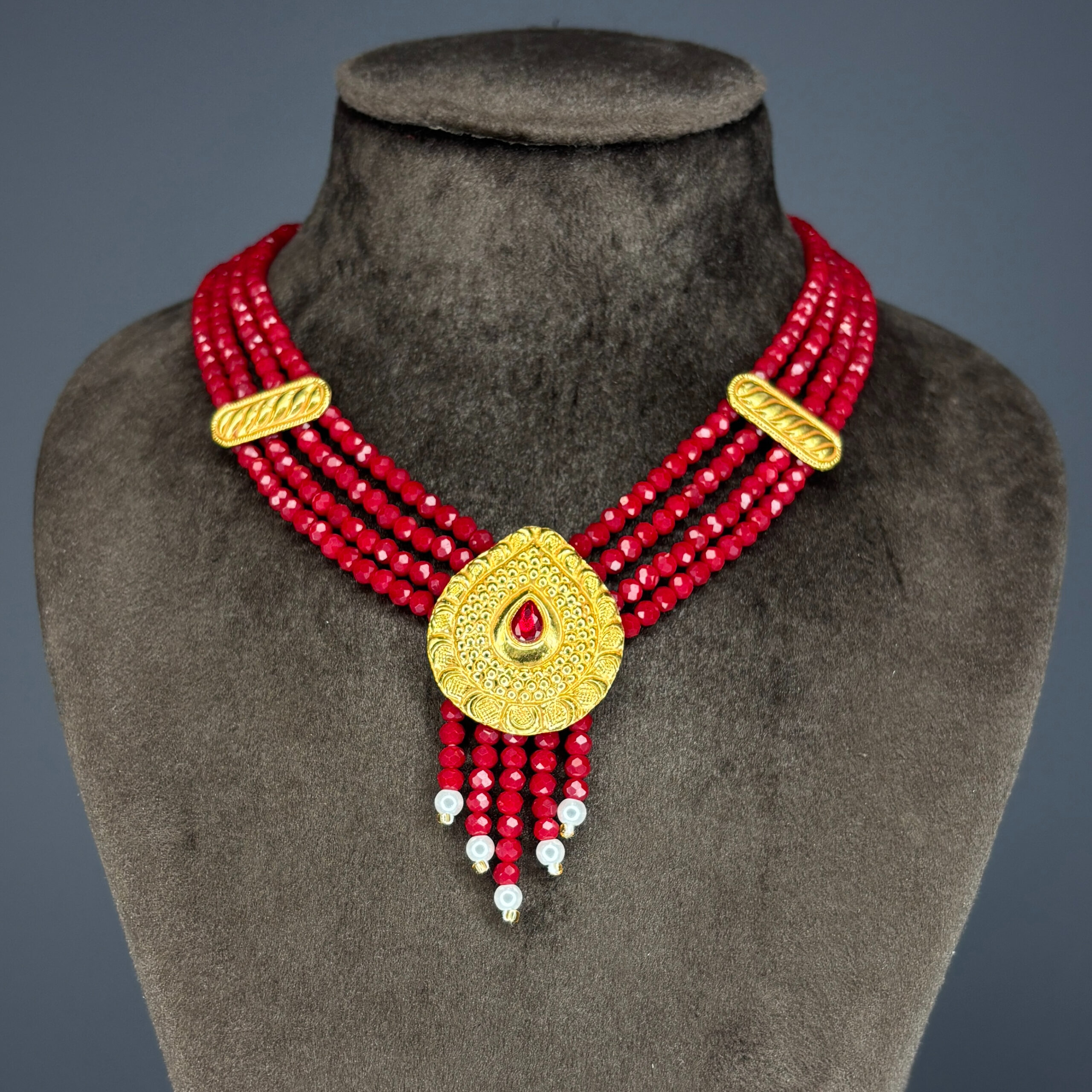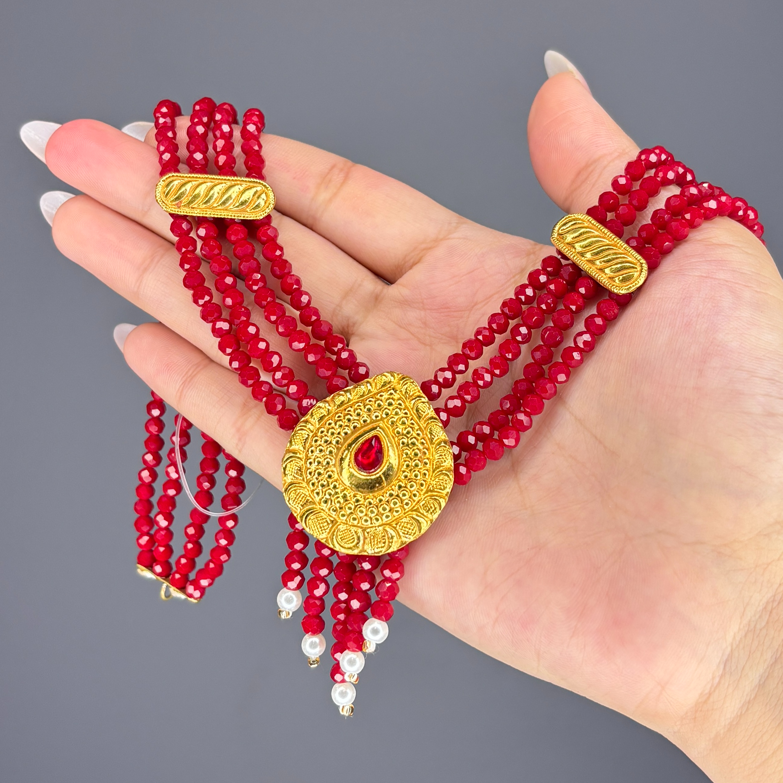 This is a close-up of a vibrant traditional joolry item, it has high-purity 24 KT gold for its metal elements. The piece features a decorative drop made of sparkling red faceted beads. It is a single, ornate traditional piece.