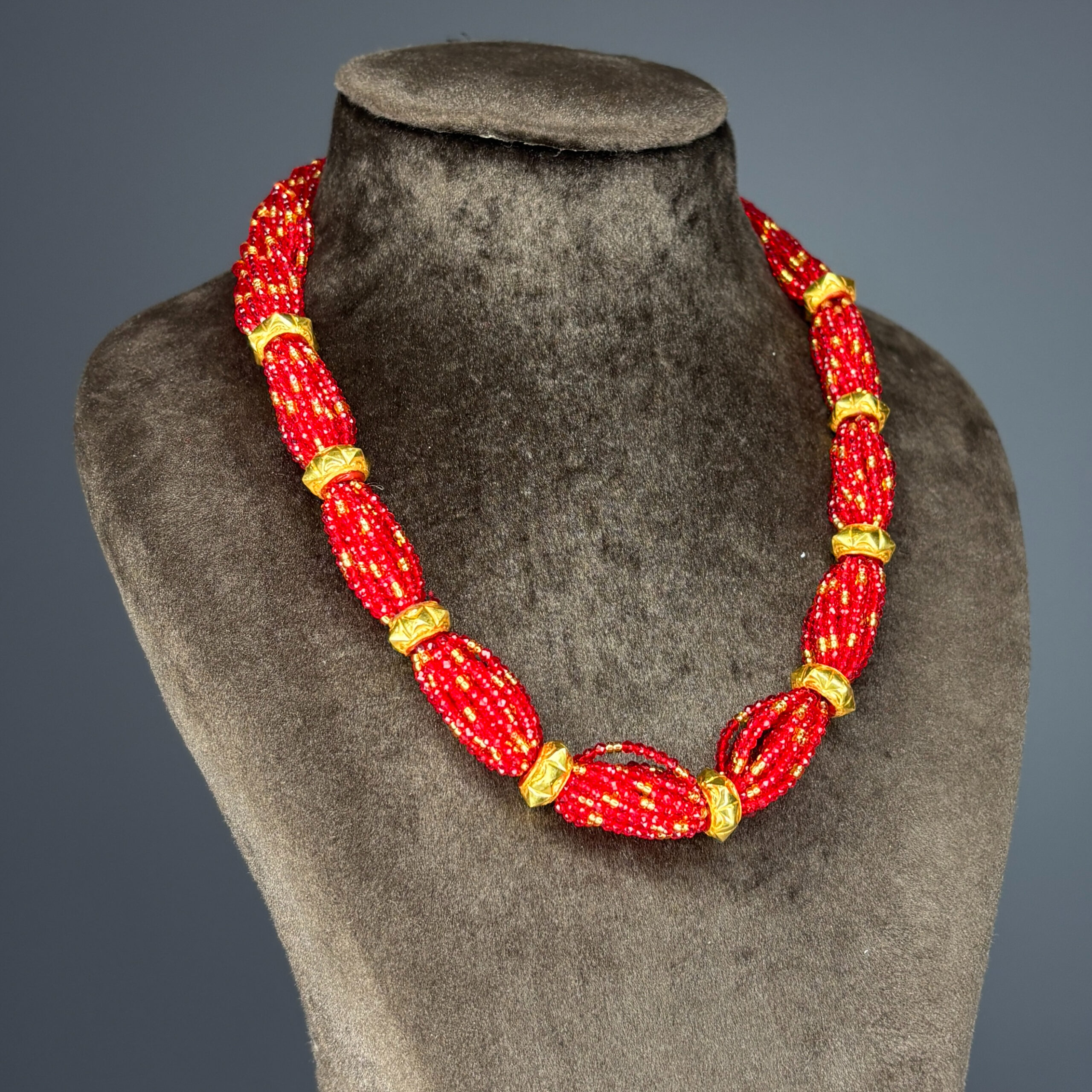 This is a close-up of a vibrant traditional joolry item, it has high-purity 24 KT gold for its metal elements. The piece features a decorative drop made of sparkling red faceted beads. It is a single, ornate traditional piece.