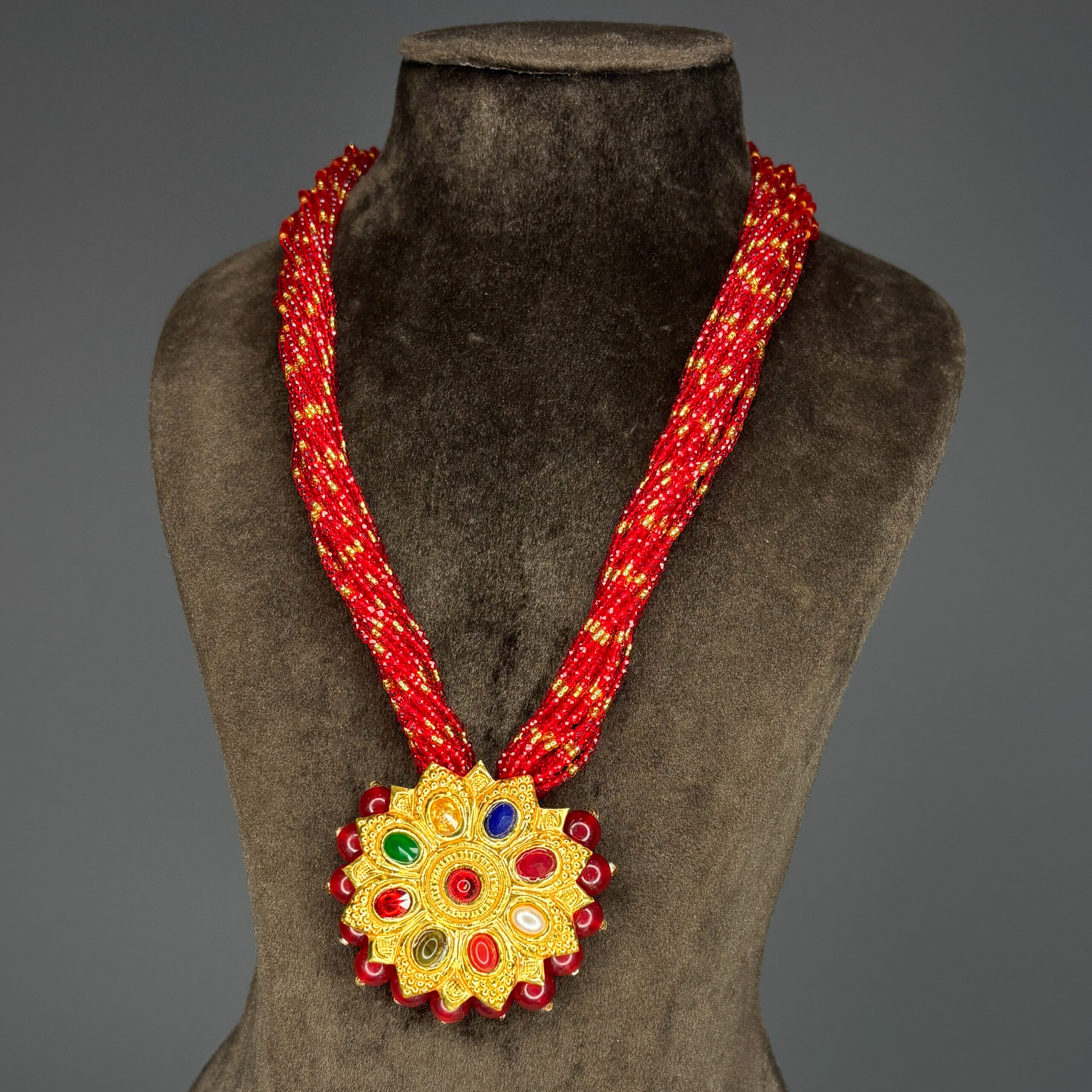 This is a close-up of a vibrant traditional joolry item, it has high-purity 24 KT gold for its metal elements. The piece features a decorative drop made of sparkling red faceted beads. It is a single, ornate traditional piece.