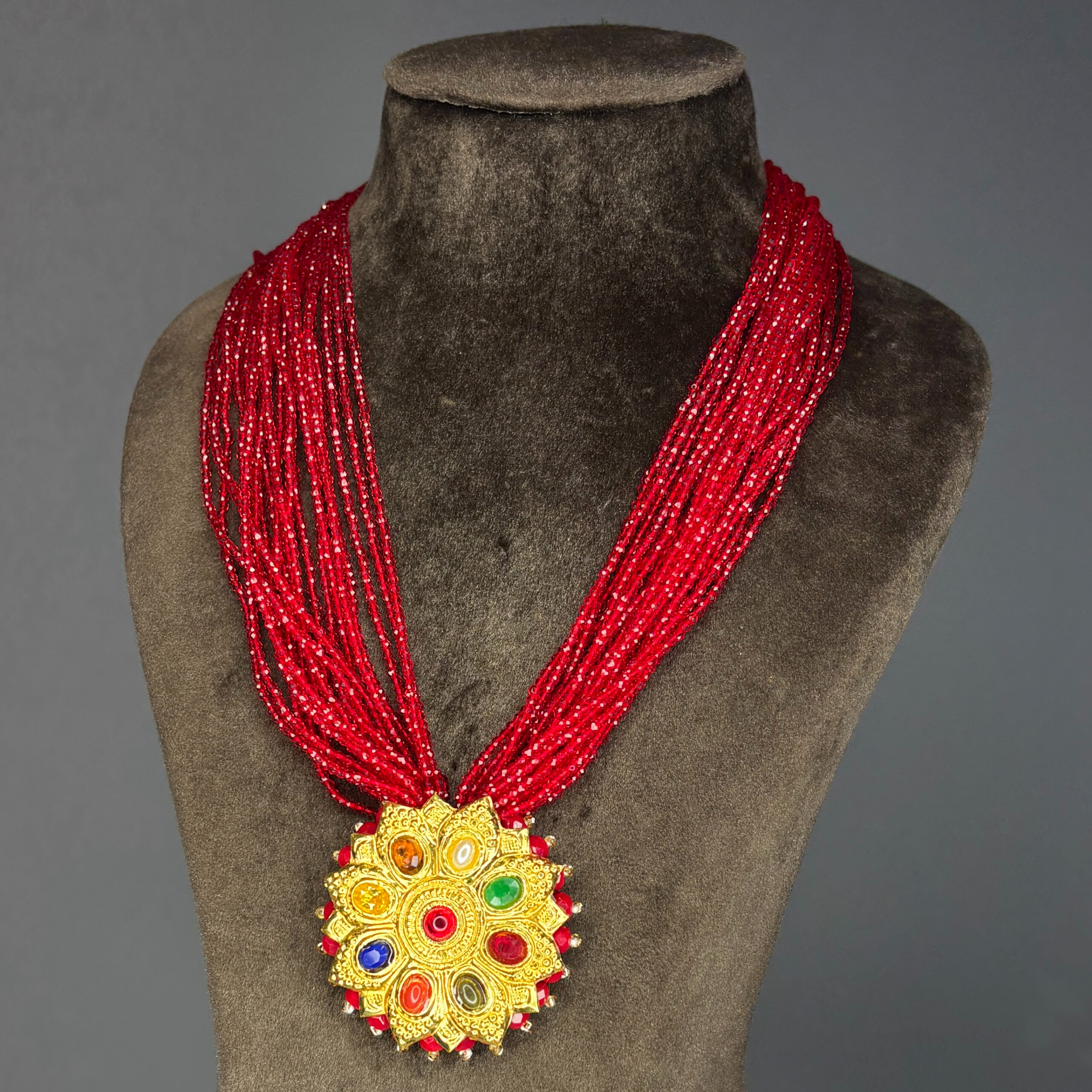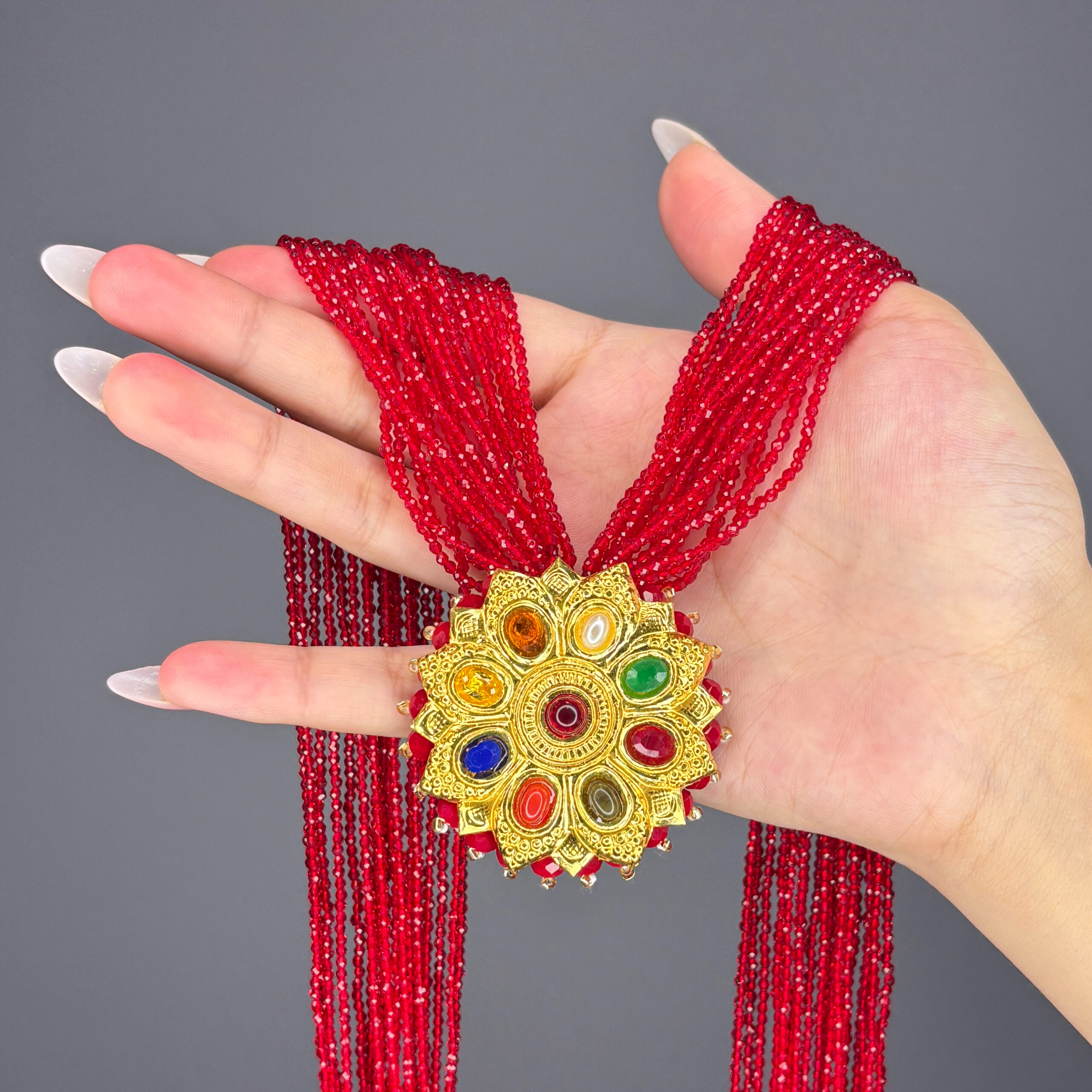 This is a close-up of a vibrant traditional joolry item, it has high-purity 24 KT gold for its metal elements. The piece features a decorative drop made of sparkling red faceted beads. It is a single, ornate traditional piece.
