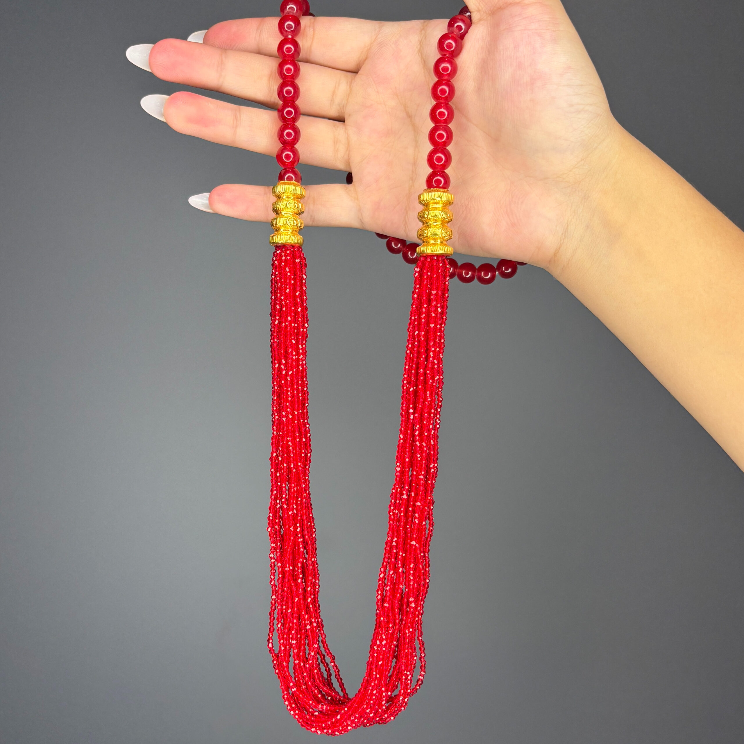 This is a close-up of a vibrant traditional joolry item, it has high-purity 24 KT gold for its metal elements. The piece features a decorative drop made of sparkling red faceted beads. It is a single, ornate traditional piece.