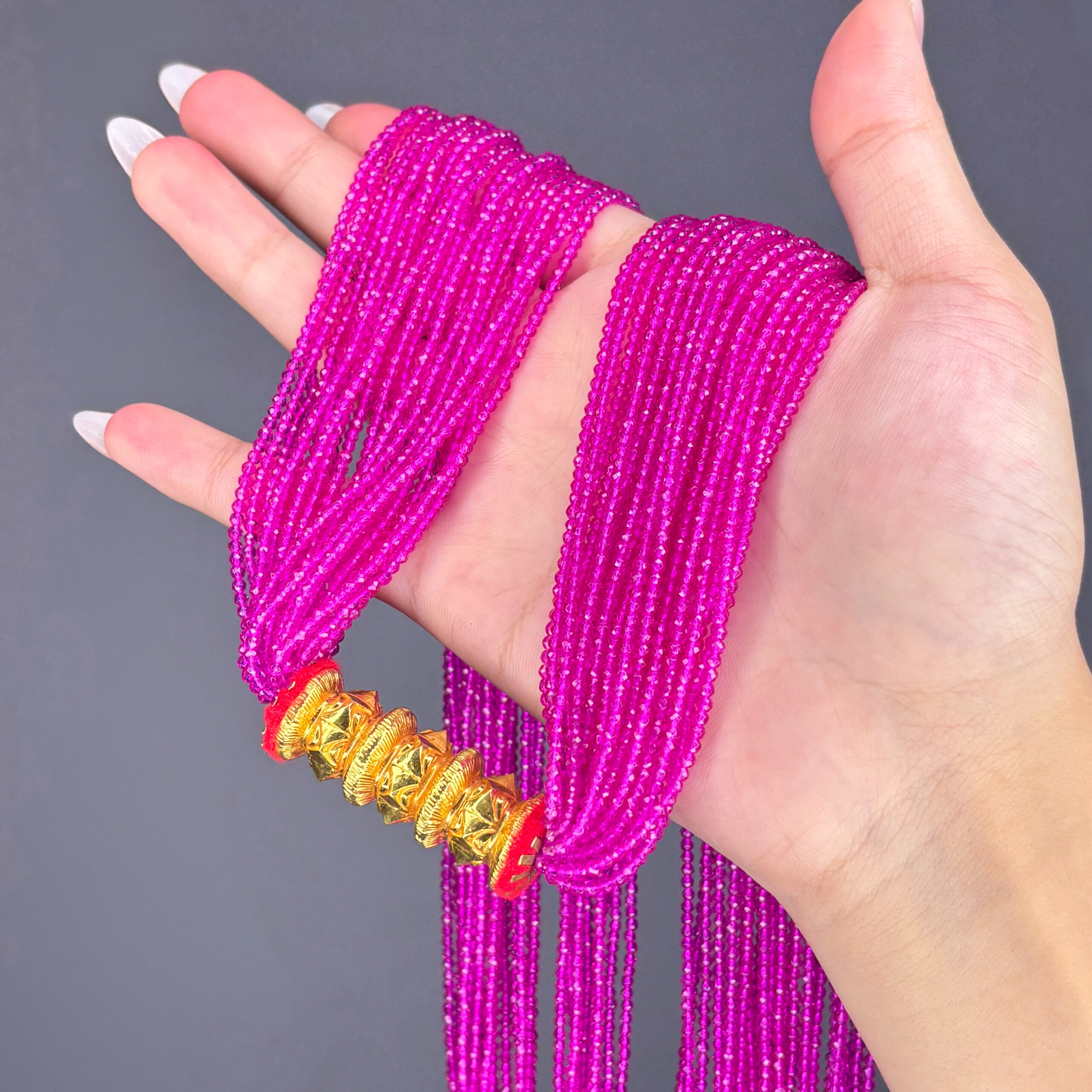This is a close-up of a vibrant traditional joolry item, it has high-purity 24 KT gold for its metal elements. The piece features a decorative drop made of sparkling PINK faceted beads. It is a single, ornate traditional piece.