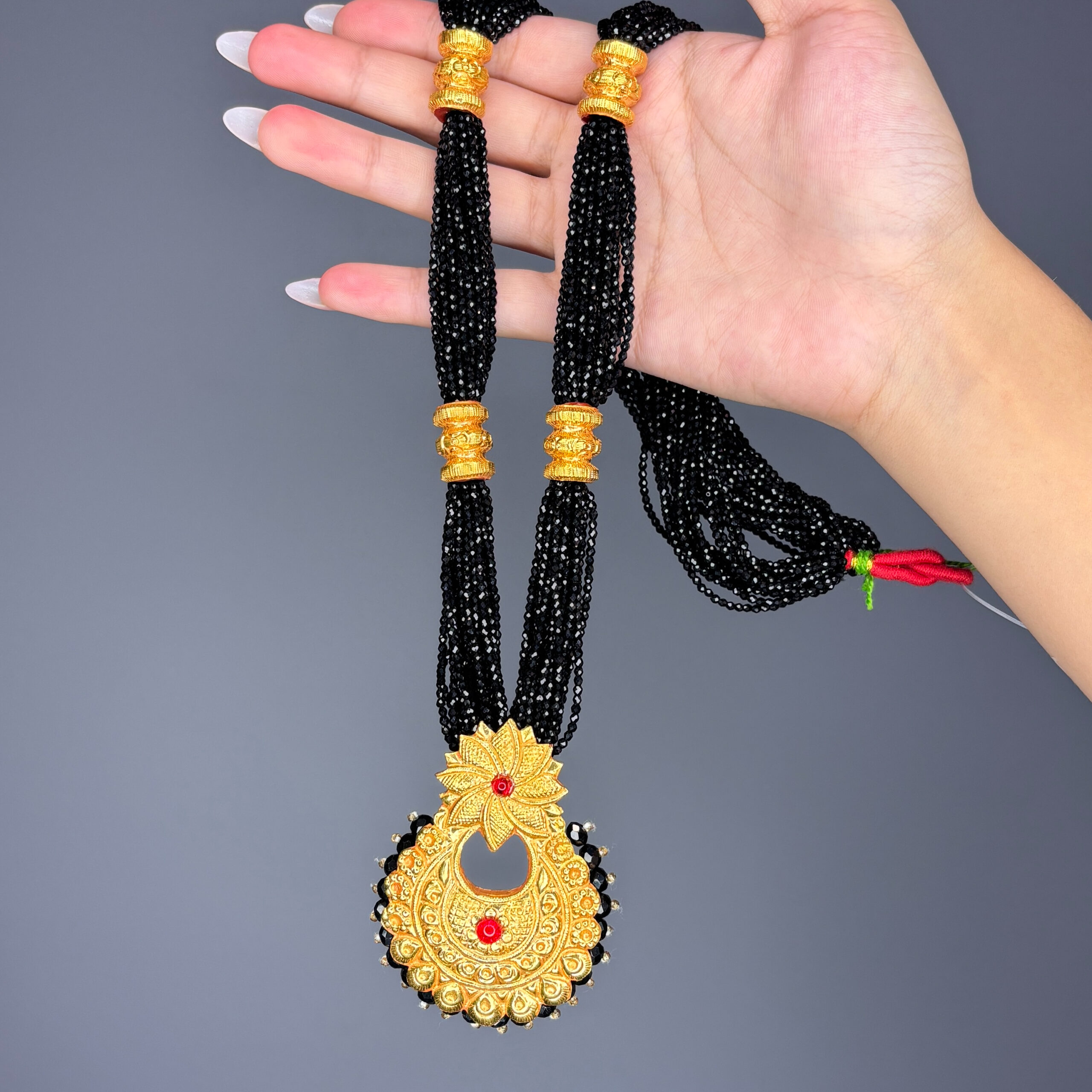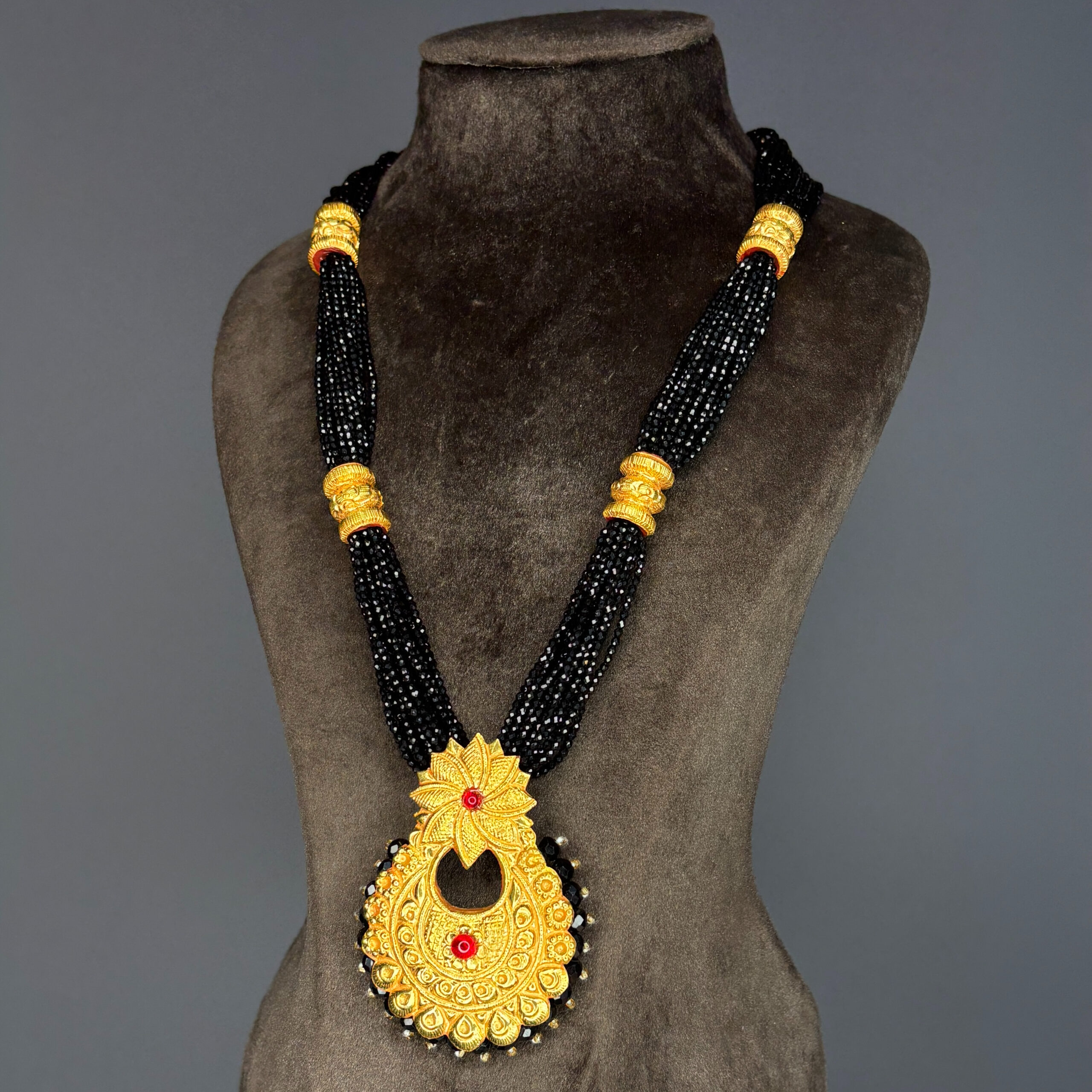 This is a close-up of a vibrant traditional joolry item, it has high-purity 24 KT gold for its metal elements. The piece features a decorative drop made of sparkling BLACK faceted beads. It is a single, ornate traditional piece.