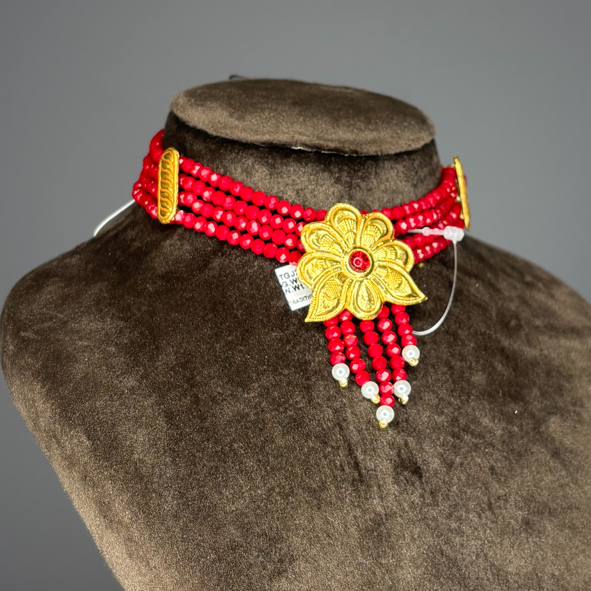 This is a close-up of a vibrant traditional joolry item, it has high-purity 24 KT gold for its metal elements. The piece features a decorative drop made of sparkling red faceted beads. It is a single, ornate traditional piece.