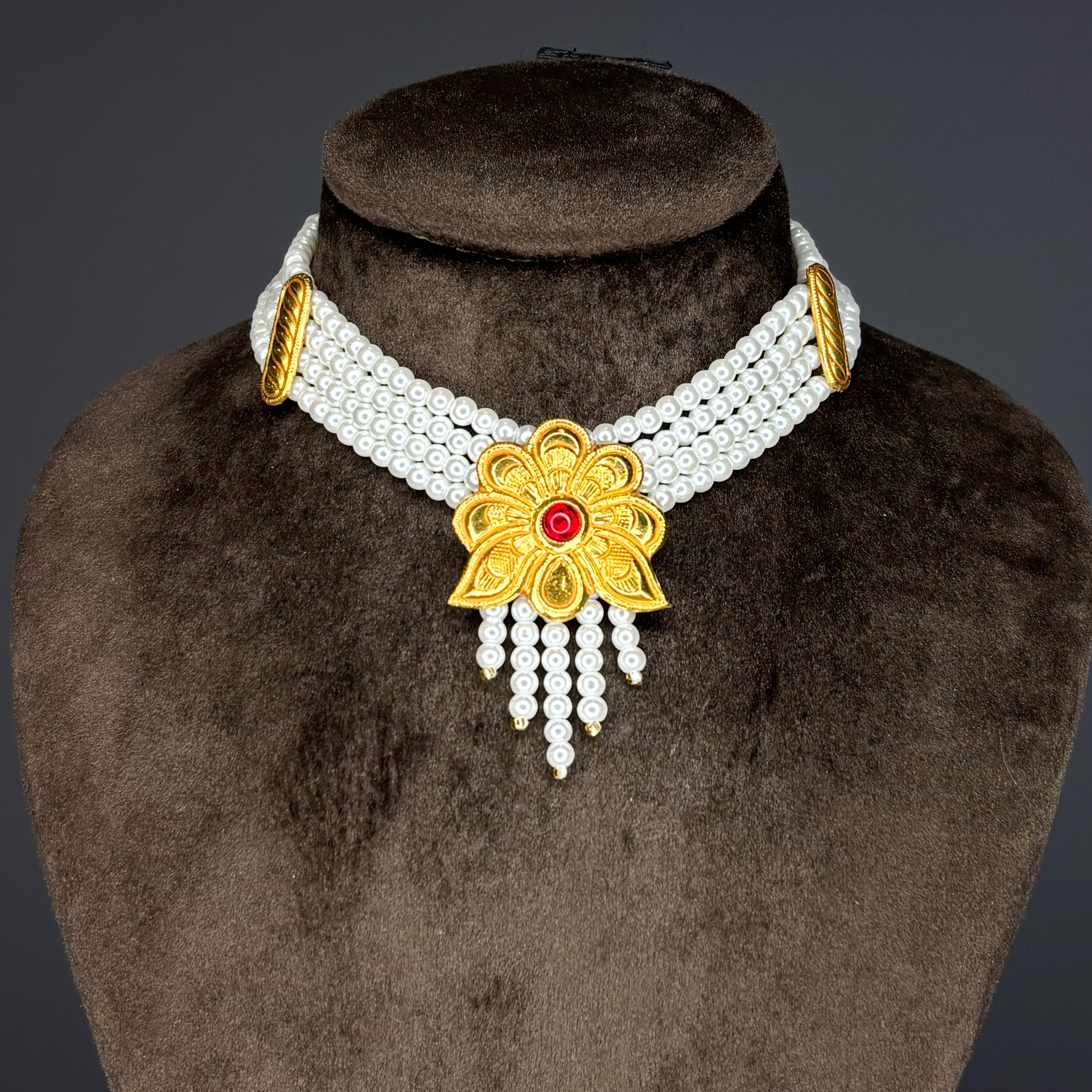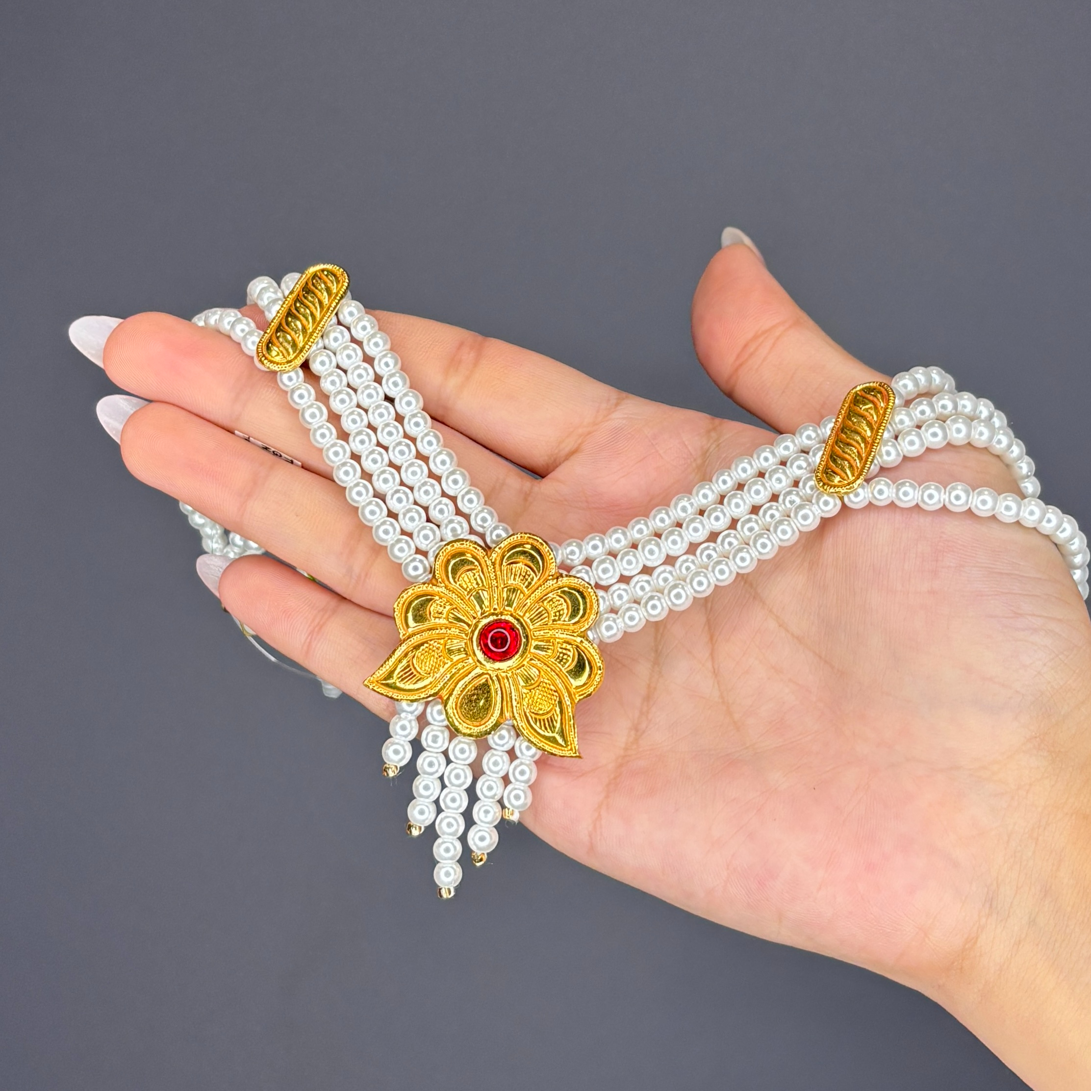 This is a close-up of a vibrant traditional joolry item, it has high-purity 24 KT gold for its metal elements. The piece features a decorative drop made of sparkling WHITE faceted beads. It is a single, ornate traditional piece.