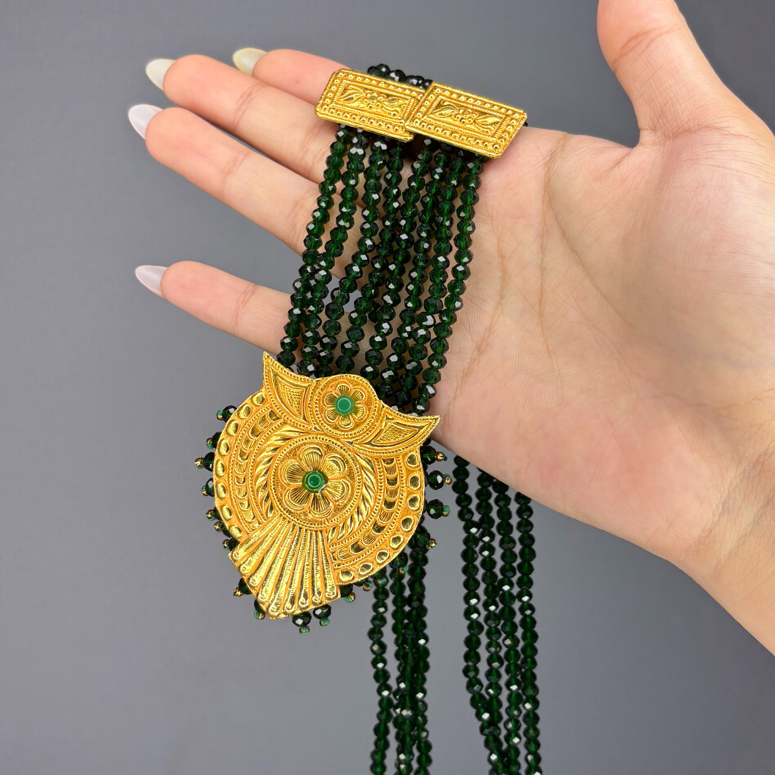 Experience royal elegance with our Crystal Rani Haar. Cascading green crystals are accented 24KT gold spacers. This lightweight masterpiece blends traditional design with timeless style, making it a captivating statement piece for any grand occasion.