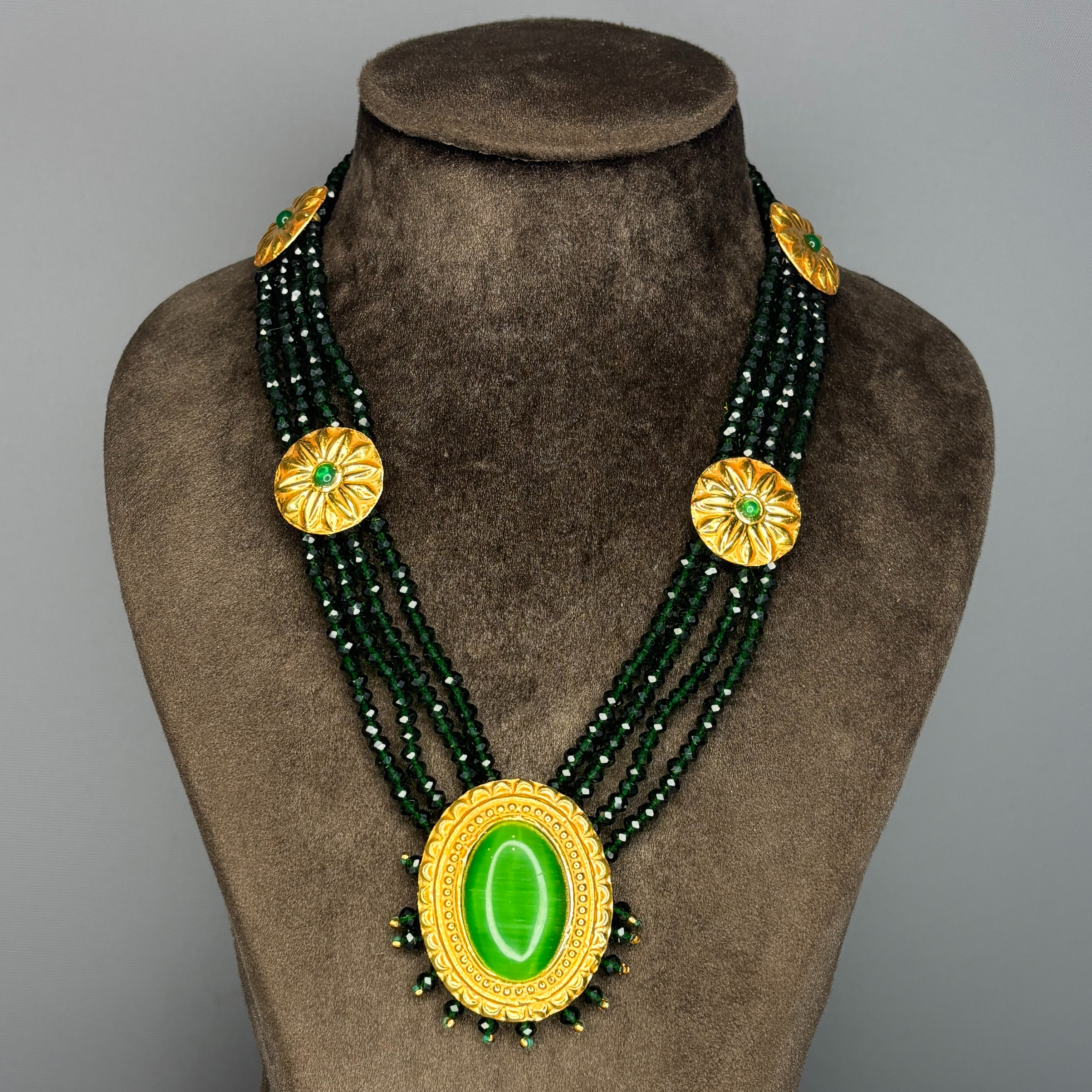 Experience royal elegance with our Crystal Rani Haar. Cascading green crystals are accented 24KT gold spacers. This lightweight masterpiece blends traditional design with timeless style, making it a captivating statement piece for any grand occasion.
