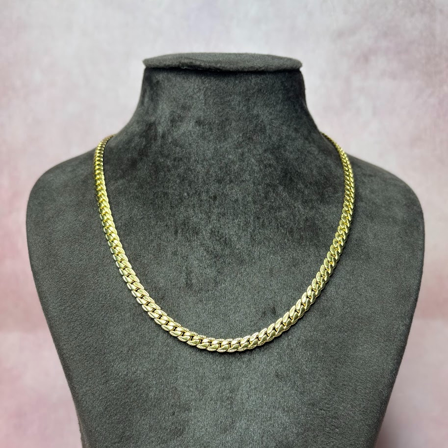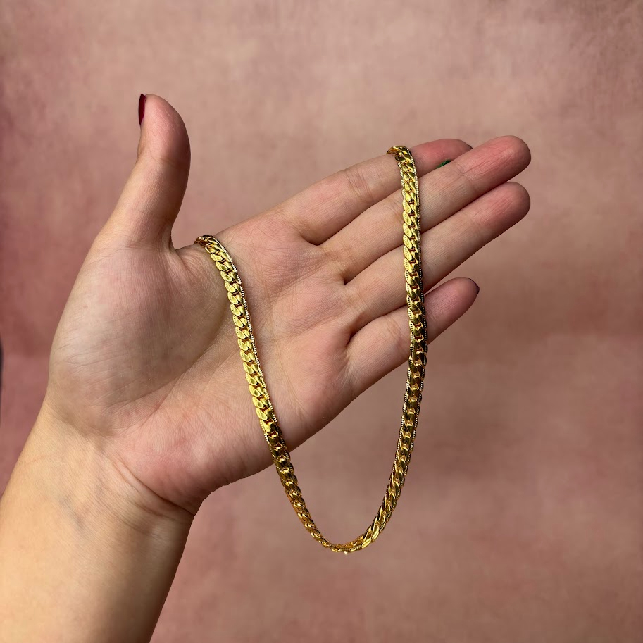 Wide, substantial gold chain necklace held in a hand. The chain features a dense, intricate link pattern, likely a double curb, Cuban curb, or modified Foxtail design. Its polished, flat surface gives it a bold, high-luster appearance. This is a durable, eye-catching statement piece.