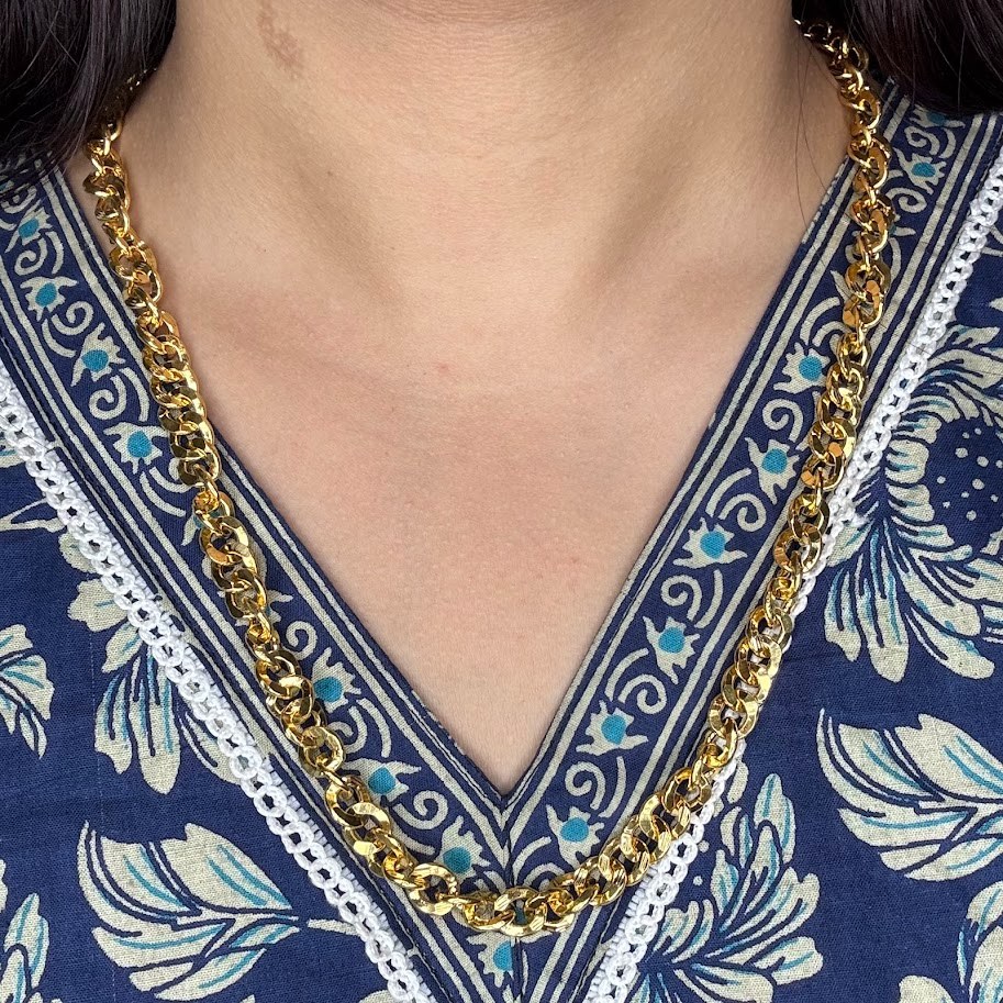A thick, heavy-gauge gold curb chain, featuring uniformly sized, highly polished, interlocking flattened links. The bright yellow gold chain, suggesting a substantial and classic design.