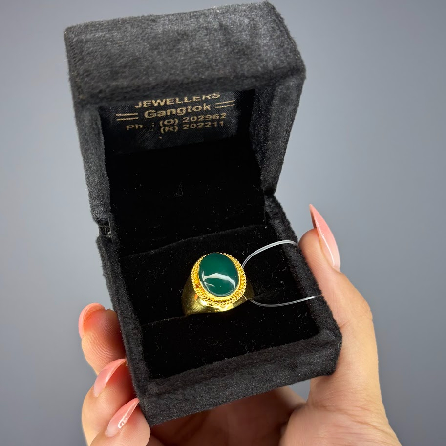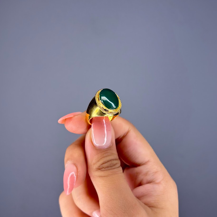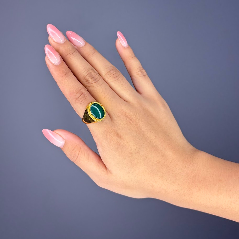 This is a substantial signet-style ring showcasing a large, oval, deep forest green gemstone cut in a cabochon style. The stone is set in a wide, gold-toned metal bezel. A notable feature is the intricate textured or braided border encircling the stone, which enhances the ring’s classic, bold, and vintage appeal. It is a prominent statement piece.
