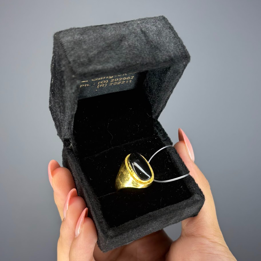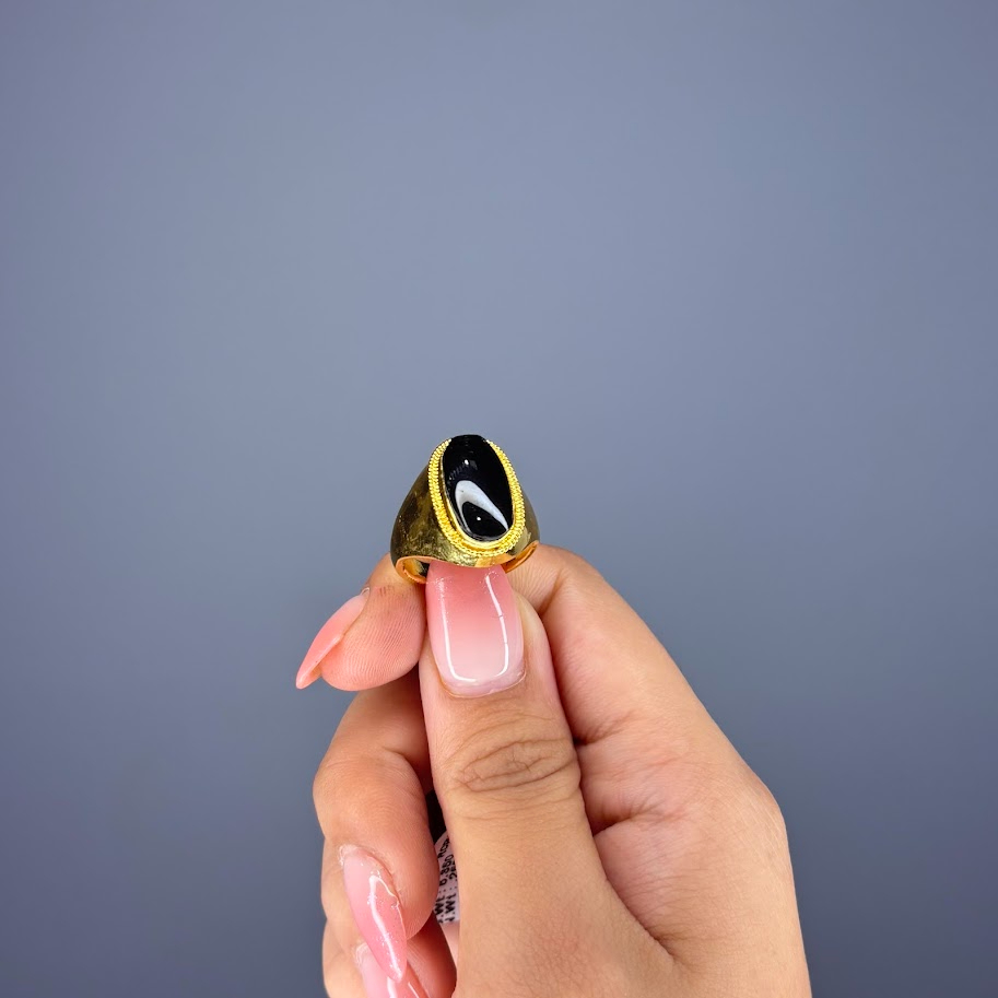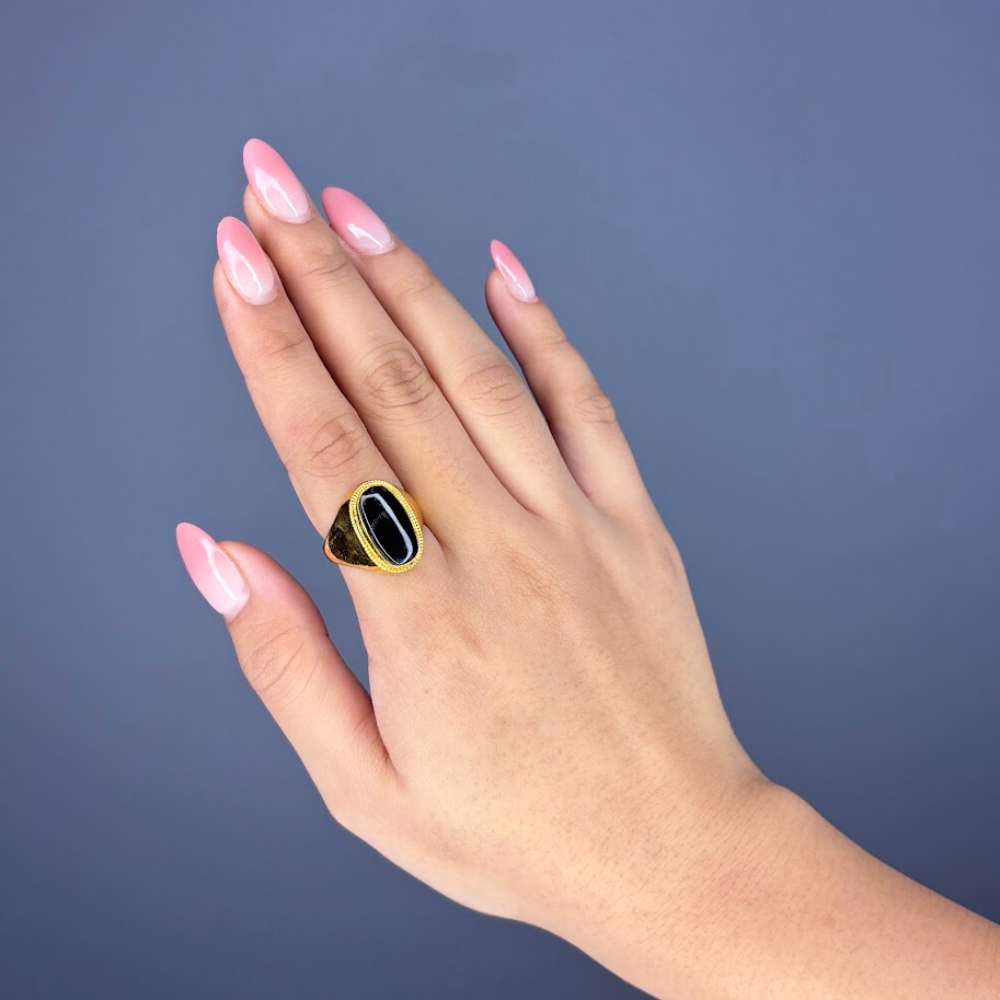 This is a statement signet ring crafted from gold-toned metal. It features a large, elongated oval cabochon gemstone in a high-gloss deep black color, likely onyx. The stone is secured by a bezel that has a distinct textured or rope-like border detail, adding a classic, decorative element to the bold design.