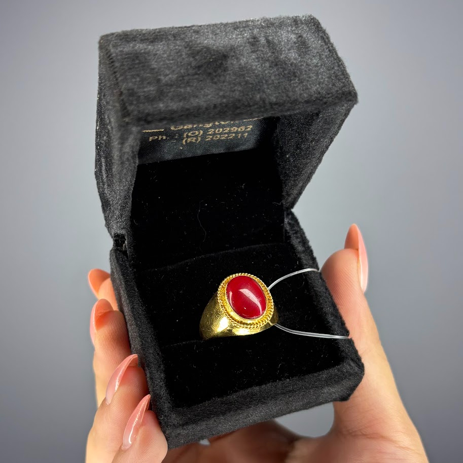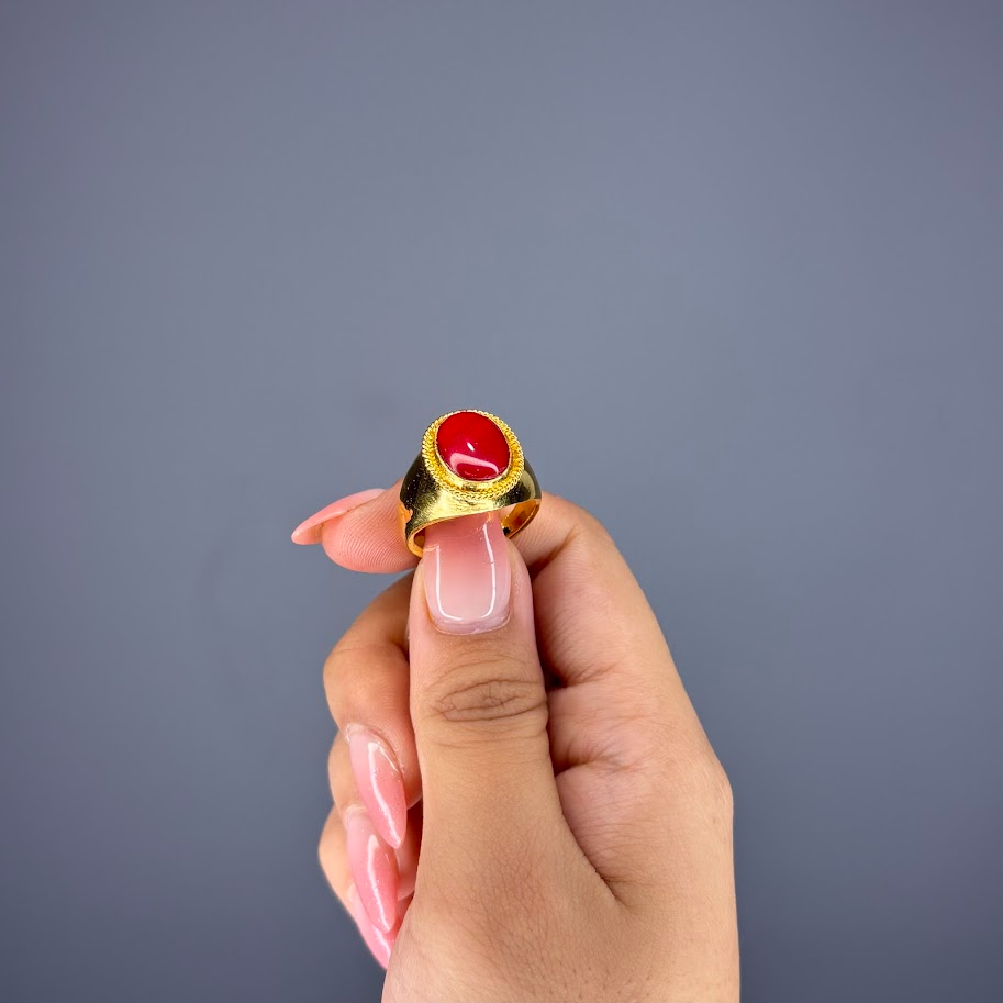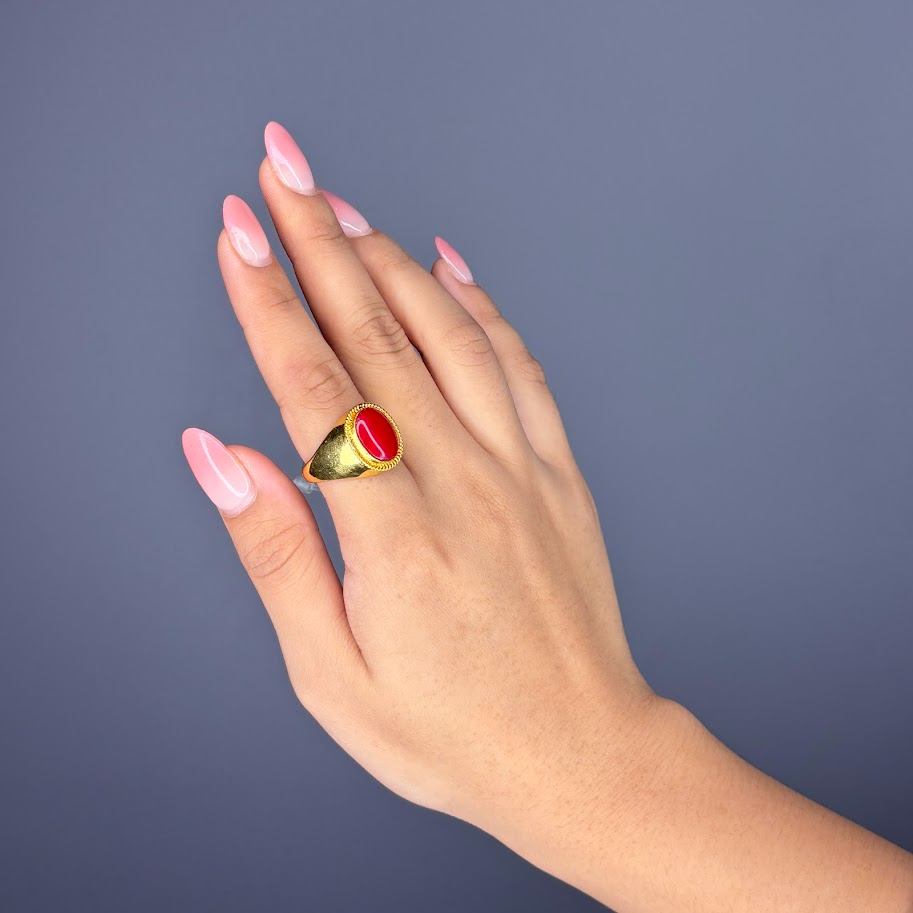 This is a bold signet-style ring with a substantial gold-toned band. It prominently features a large, smooth oval cabochon gemstone in a vibrant, rich red color, possibly coral or carnelian. The setting includes an intricate textured or beaded detail bordering the stone, giving the ring a classic, striking, and regal aesthetic.