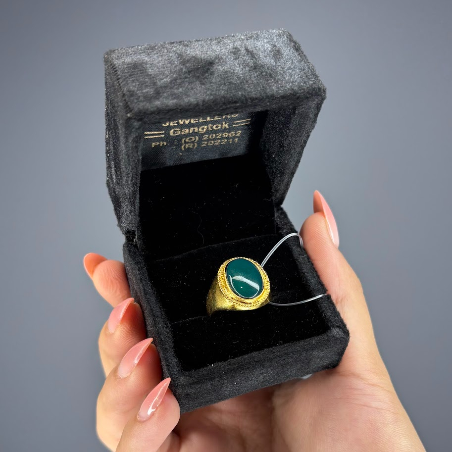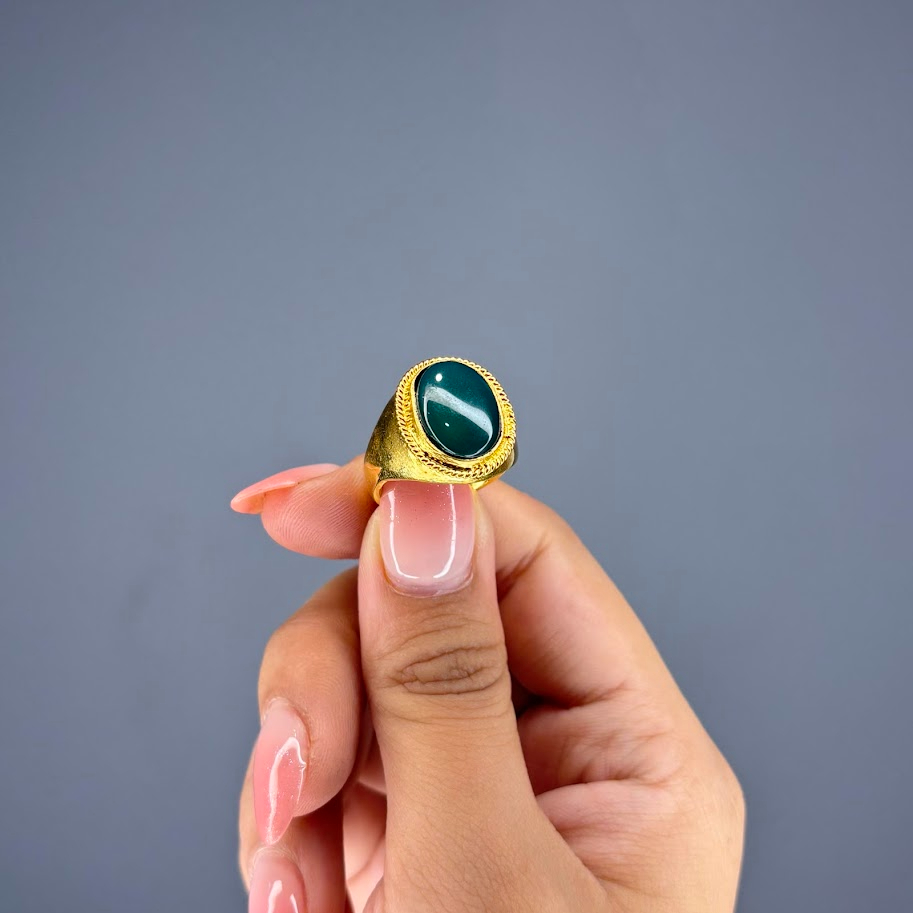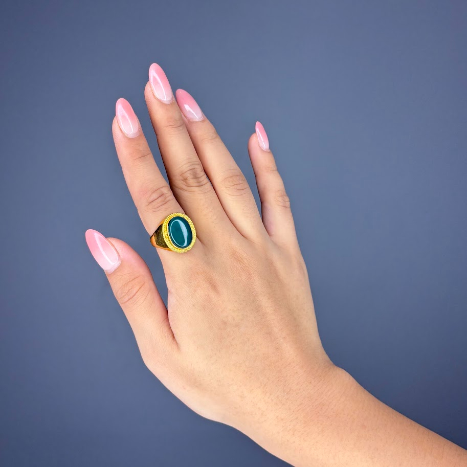 This is a bold signet-style ring with a substantial gold-toned band. It showcases a prominent oval cabochon gemstone in a deep teal or blue-green color. The setting features a textured or rope-like border surrounding the stone, enhancing its classic, weighty, and decorative aesthetic. It’s a striking statement accessory.