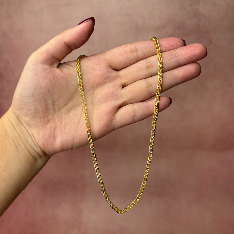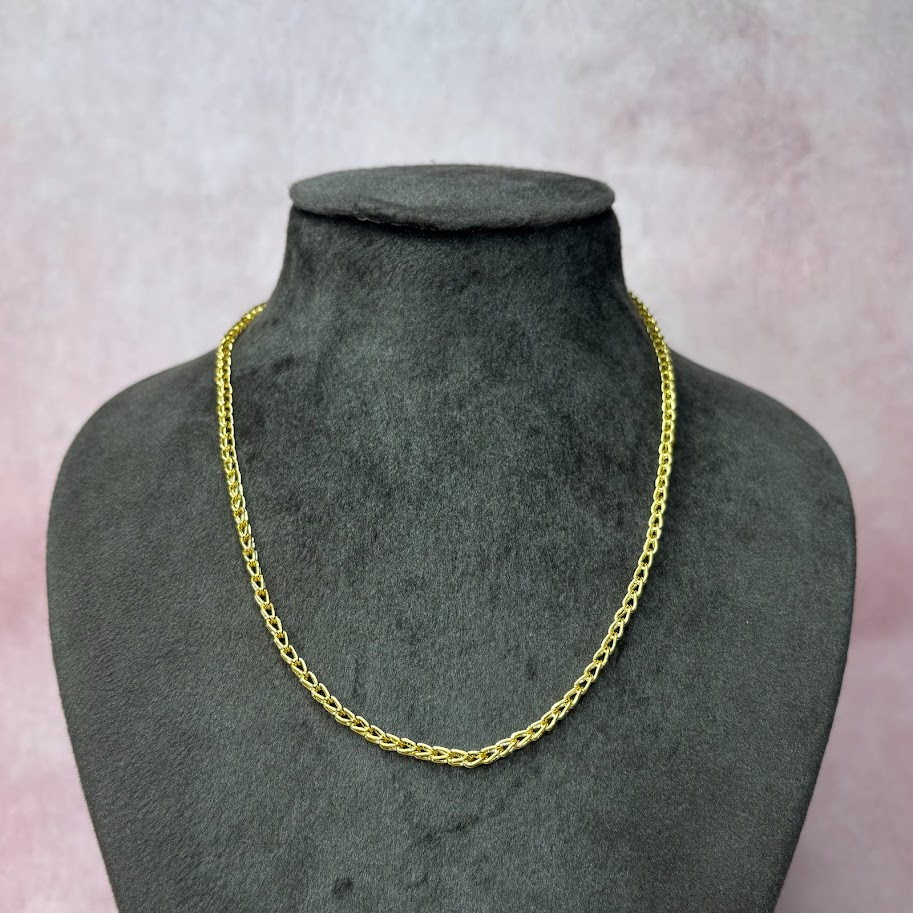 This refined yellow gold chain features a classic wheat design with woven, interlocking links. The intricate braided texture offers a sophisticated look and fluid movement. Durable yet elegant, this spiga-style necklace provides a brilliant shine perfect for everyday styling.
