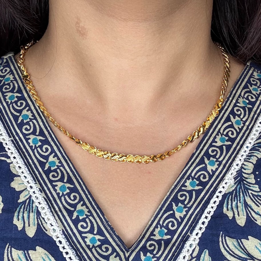 Lustrous yellow gold necklace the chain features an intricate, reflective twisted link pattern, likely a Singapore or rope chain, showcasing fine craftsmanship and brilliant shine. The V-shape drape emphasizes its fluid elegance.
