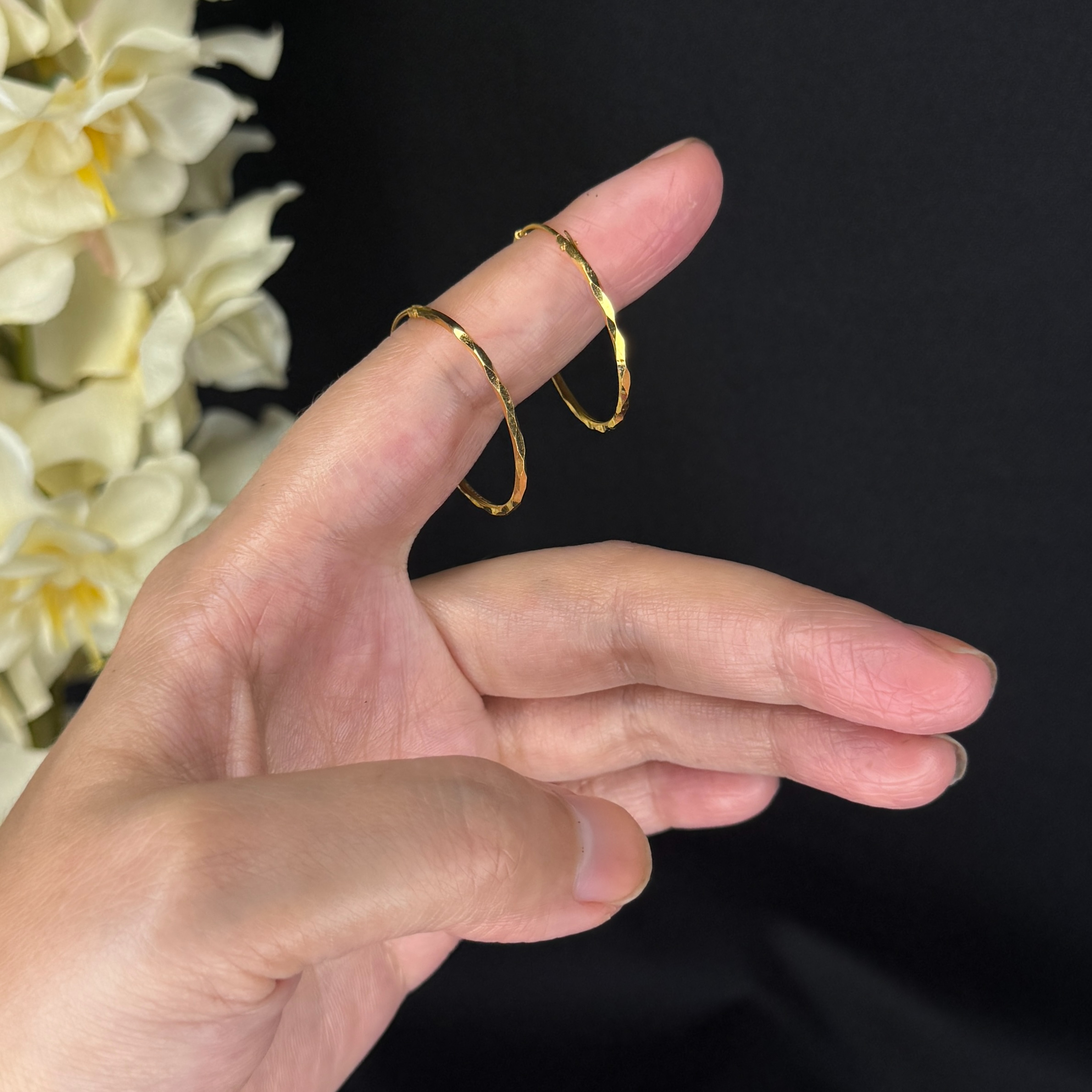 Chic, minimalist gold hoop earrings held on a finger. These subtle hoops feature a delicate, flattened textured surface that gently catches the light, perfect for everyday elegance.