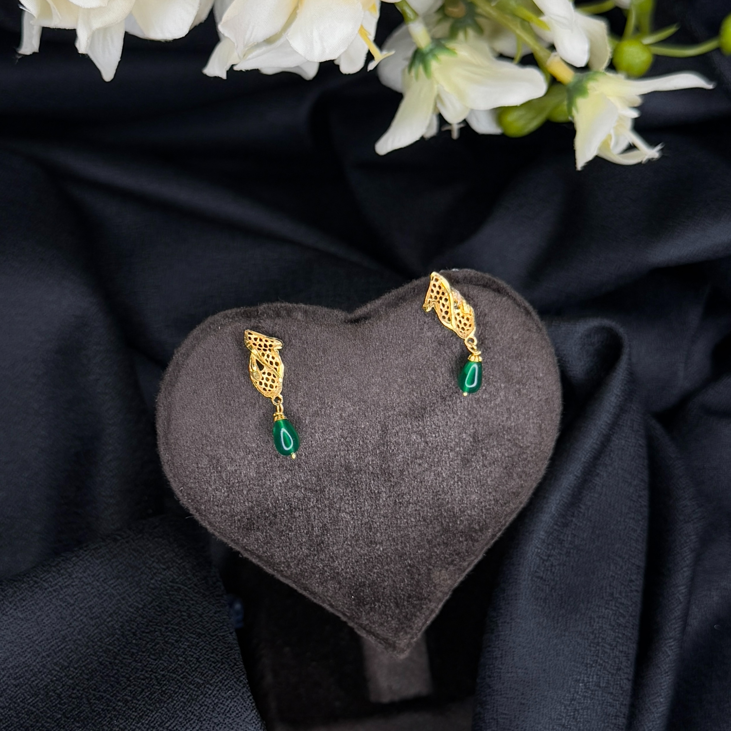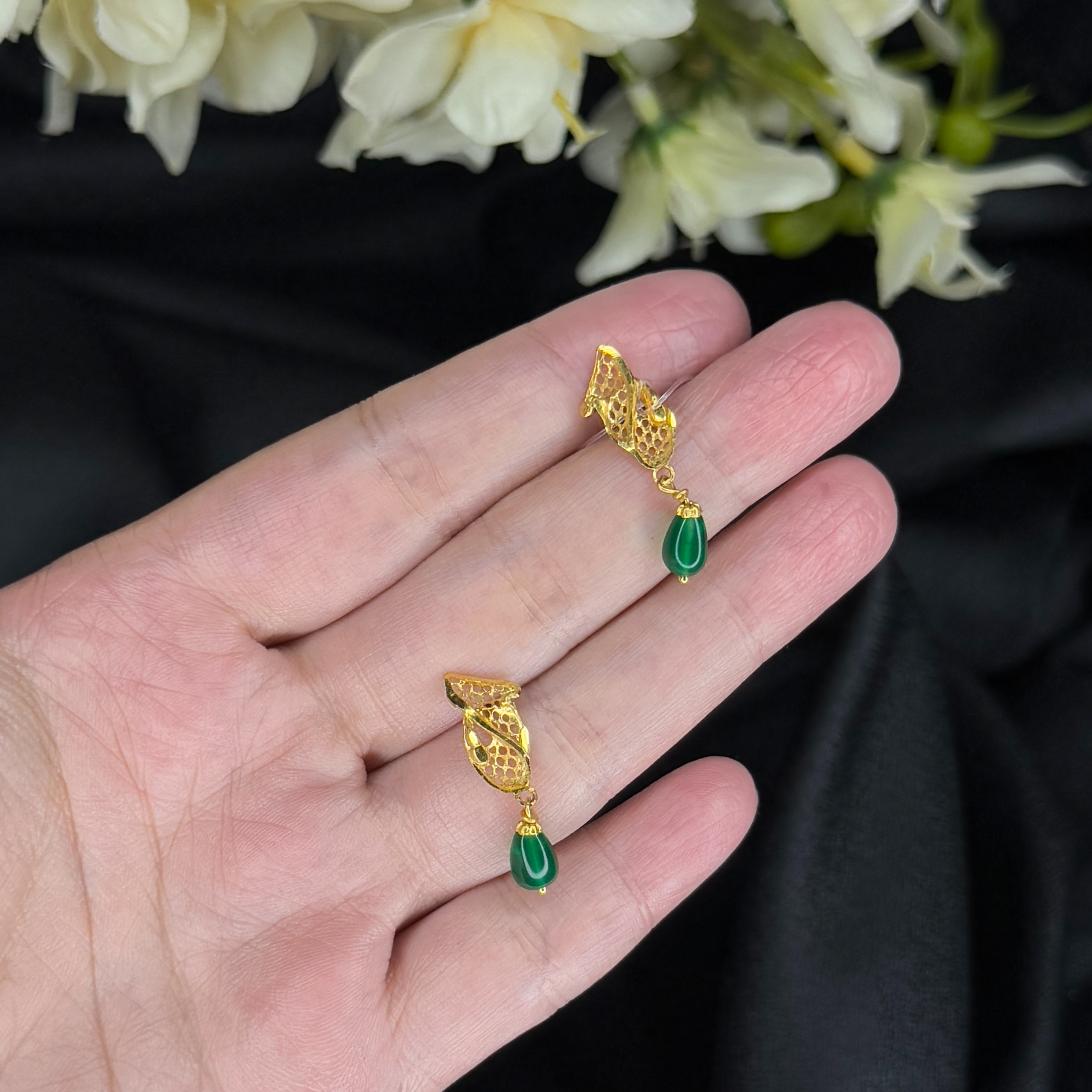 Striking gold earrings featuring an abstract, leaf-inspired stud with delicate open-work filigree. A beautiful deep-green teardrop stone is suspended below, providing a rich pop of color. These drops combine natural form with artisan craftsmanship for a uniquely elegant look.