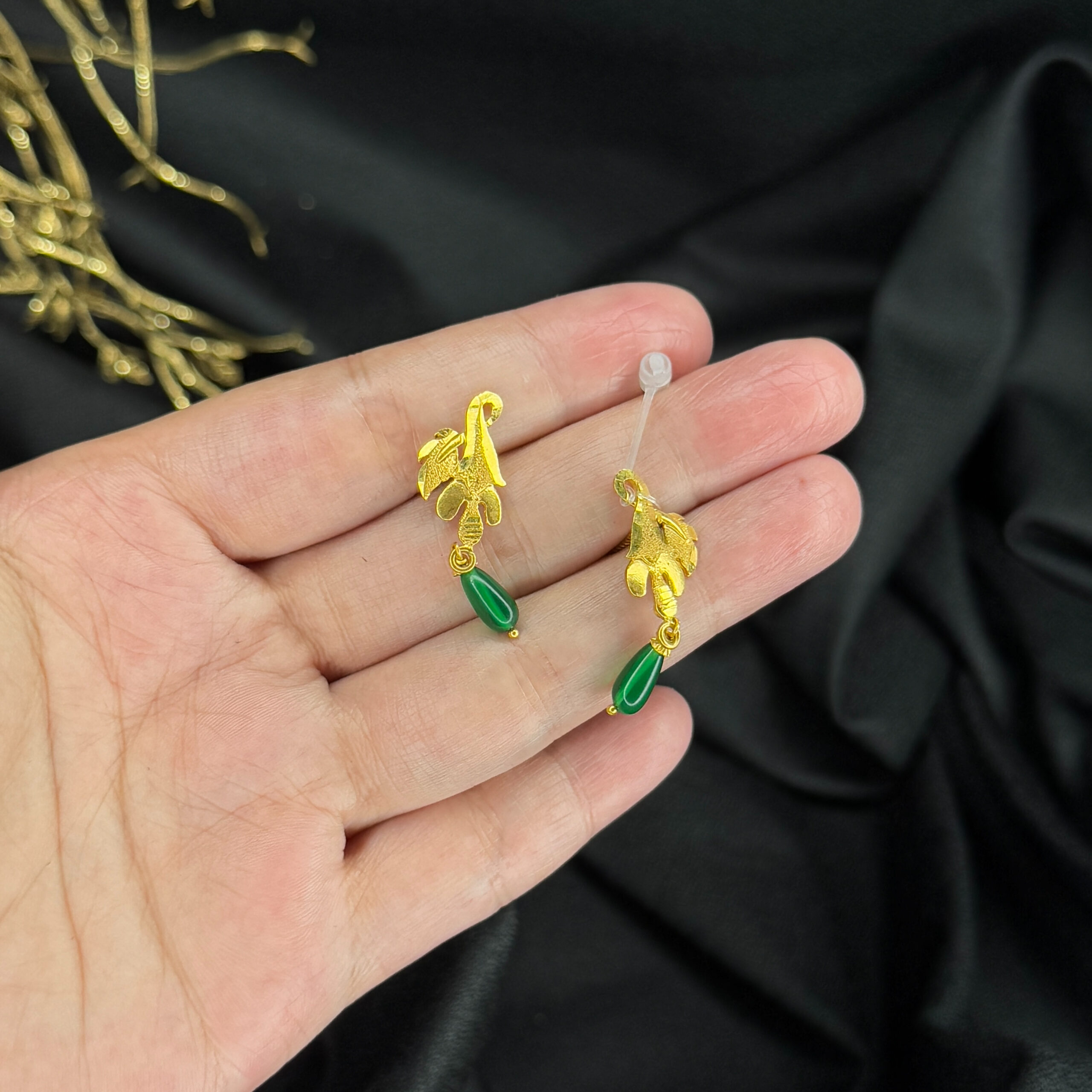 Whimsical gold-toned drop earrings featuring a stylized, textured leaf or bird motif stud. Dangling gracefully below is a polished, dark green teardrop bead. The combination of the nature-inspired gold work and the richly colored gemstone creates a unique piece with gentle movement, perfect for an elegant, artistic touch.