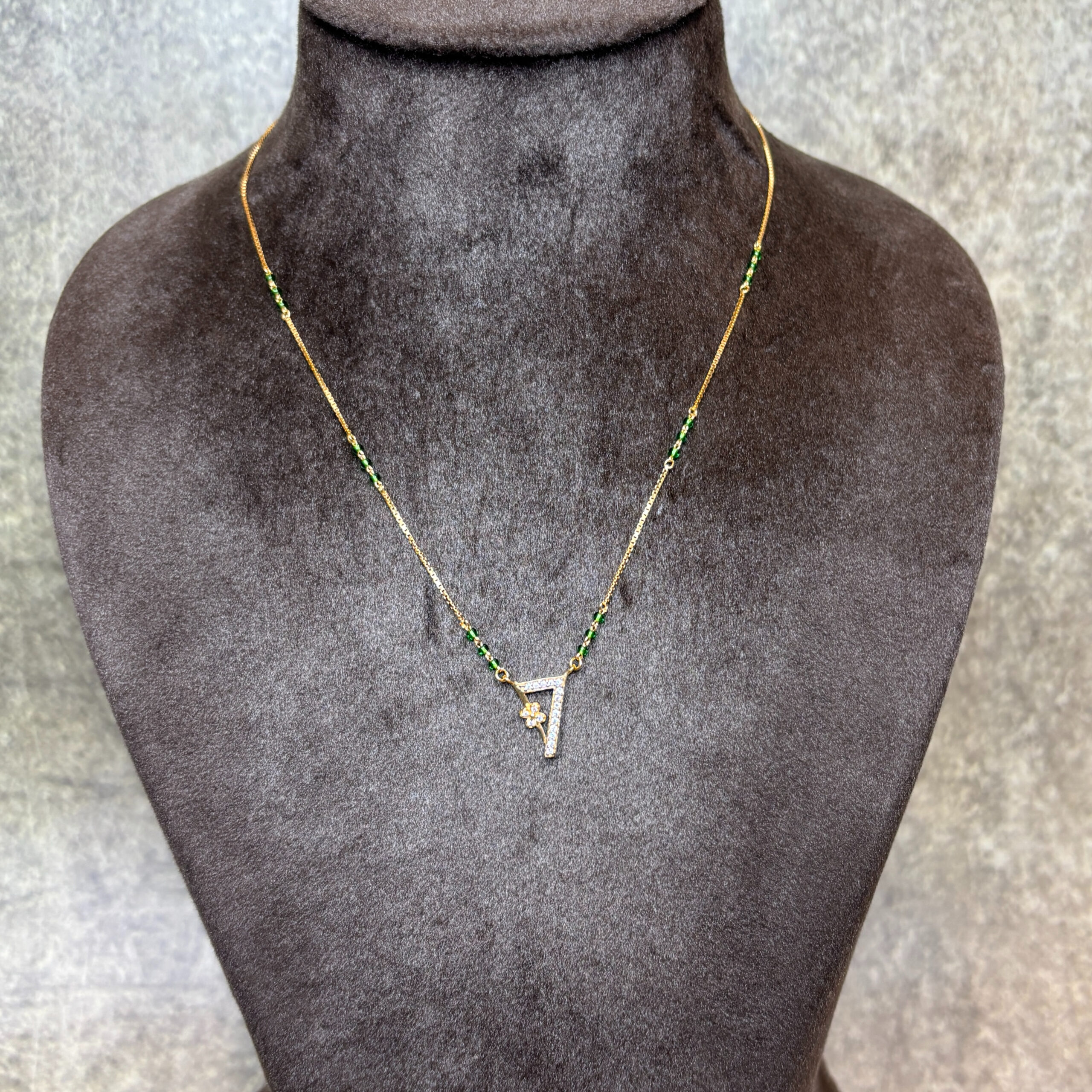 a delicate gold necklace with a leafy, floral-inspired diamond pendant. The chain features small green beads interspersed with the gold links. She is wearing a light blue, embroidered garment and pearl earrings, set against a dark background.