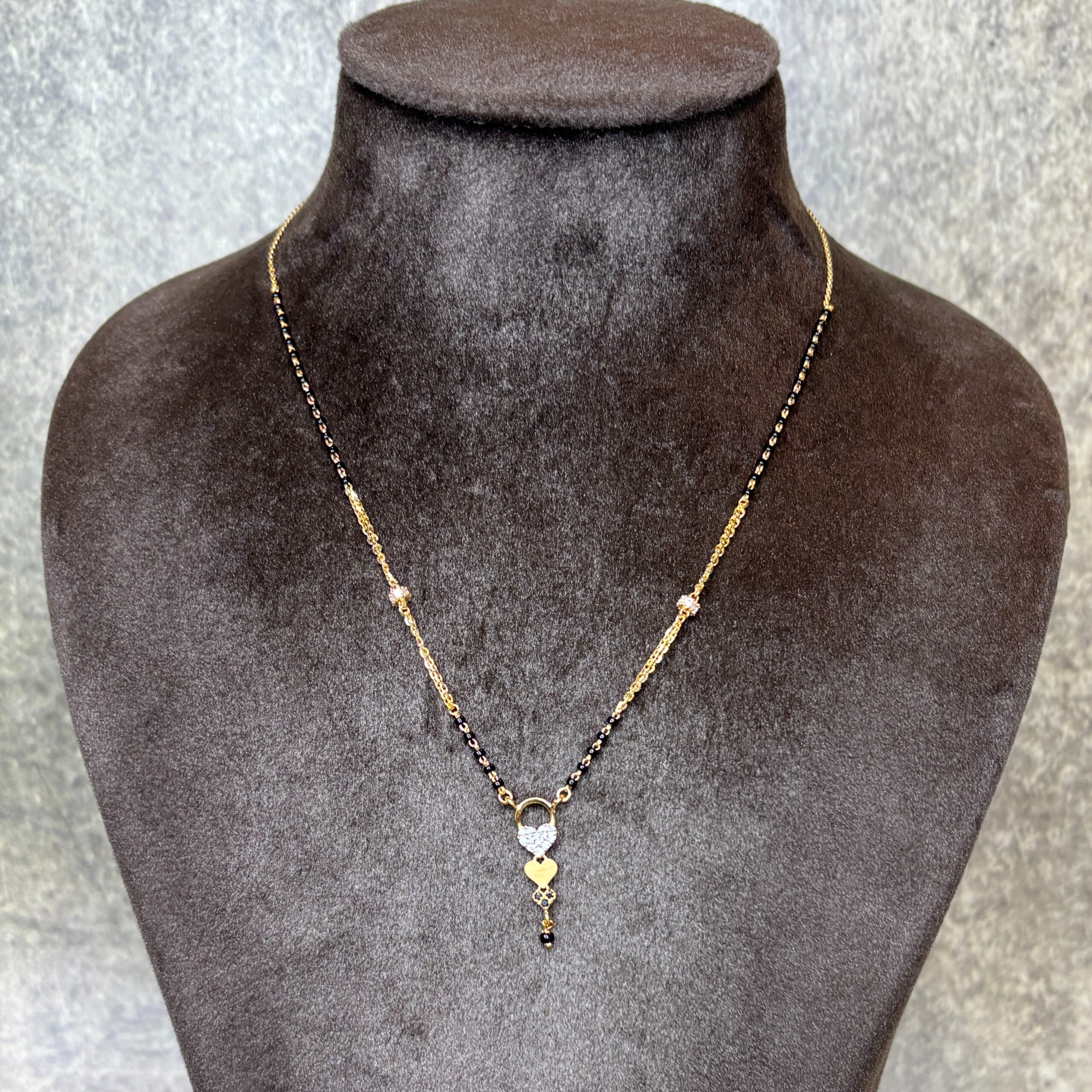 A chic gold chain featuring traditional black beads and two small diamond accents near the clasp. The pendant is a heart-shaped drop: a polished gold loop connects to a lower heart segment paved entirely with white stones. A small black bead dangles from the bottom, offering a graceful and modern statement of love.