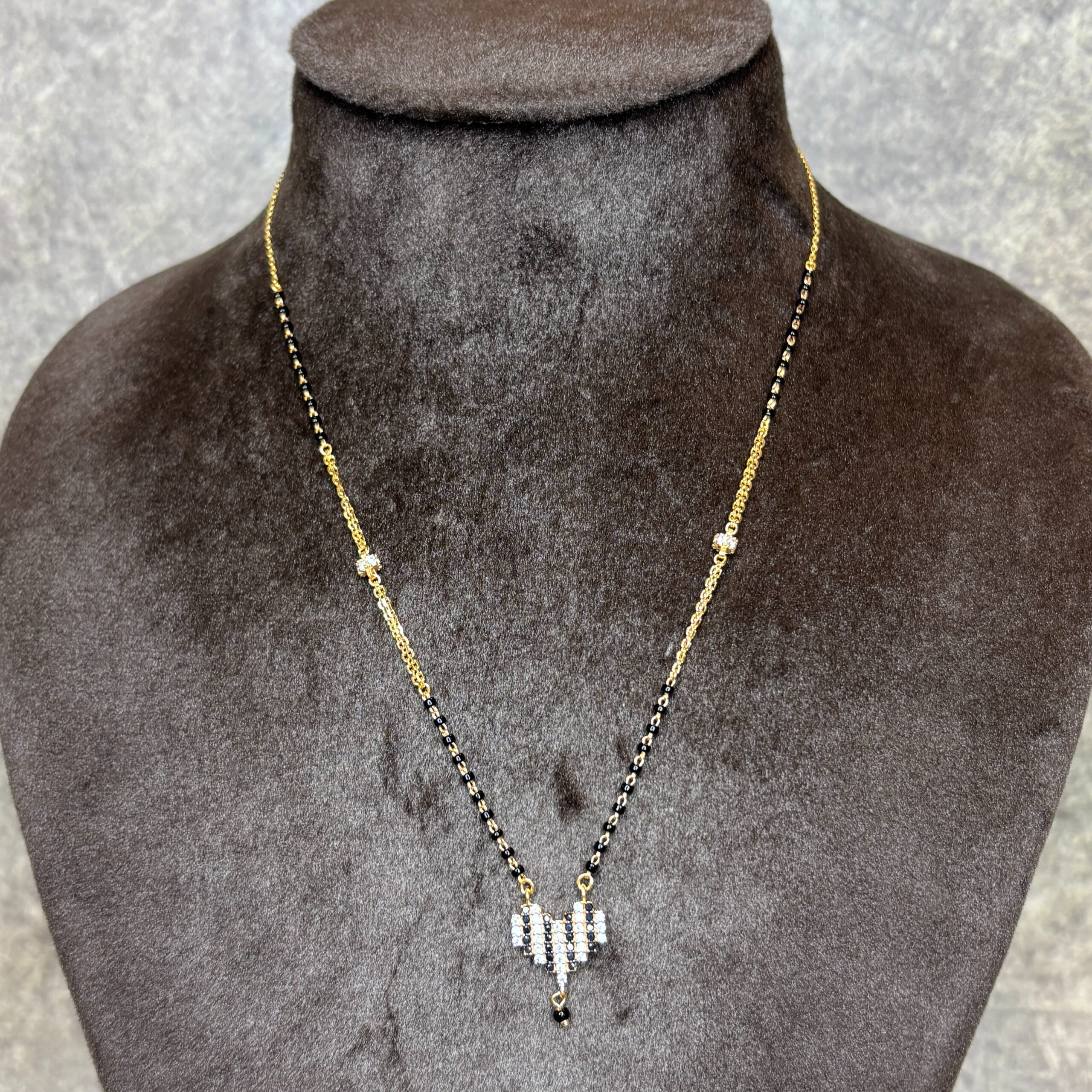 A light gold chain featuring the traditional black bead design. The striking heart pendant is paved with shimmering stones arranged in a vertical striped pattern, alternating between white and black/green stones. A small dangling black bead finishes the piece, offering a sophisticated and unique take on a classic symbol of love.