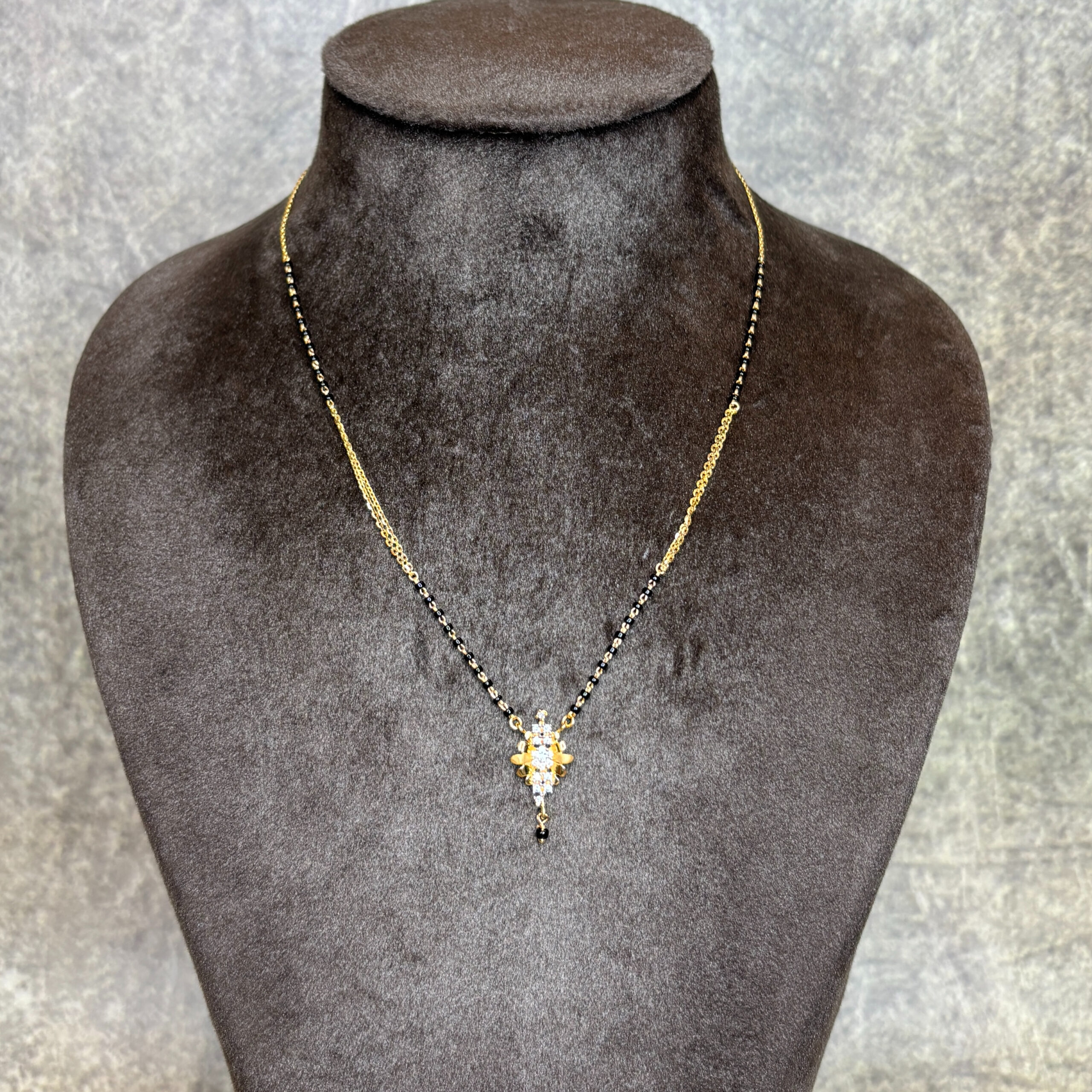 A delicate gold chain featuring the classic black bead alternating design. The stunning pendant is shaped like a small floral bloom, centered with a large sparkling stone and surrounded by intricate white stone petals. A cluster of three black accents dangles below, adding a traditional touch to this lovely, modern design.