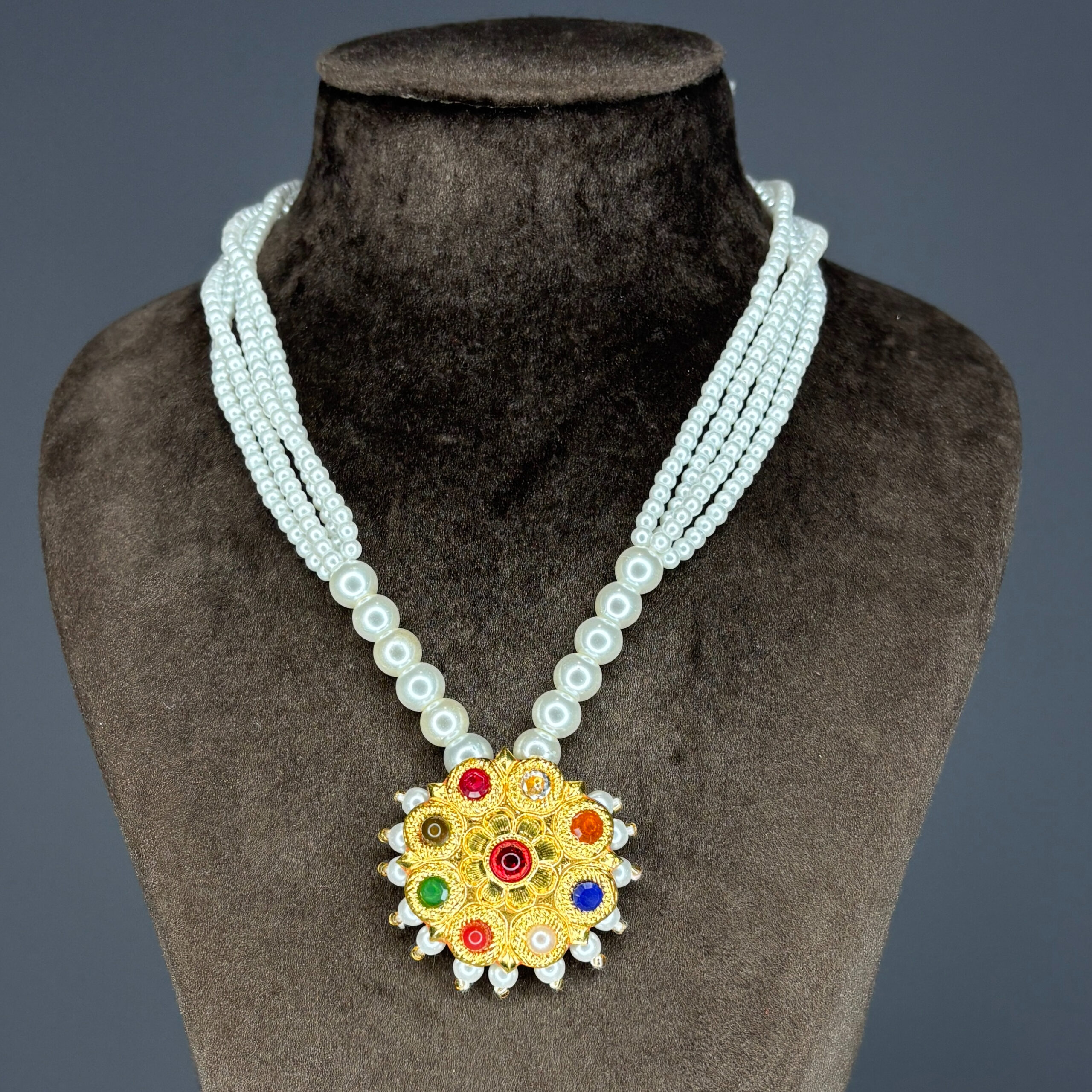 This is a close-up of a vibrant traditional joolry item, it has high-purity 24 KT gold for its metal elements. The piece features a decorative drop made of sparkling WHITE faceted pearls. It is a single, ornate traditional piece.