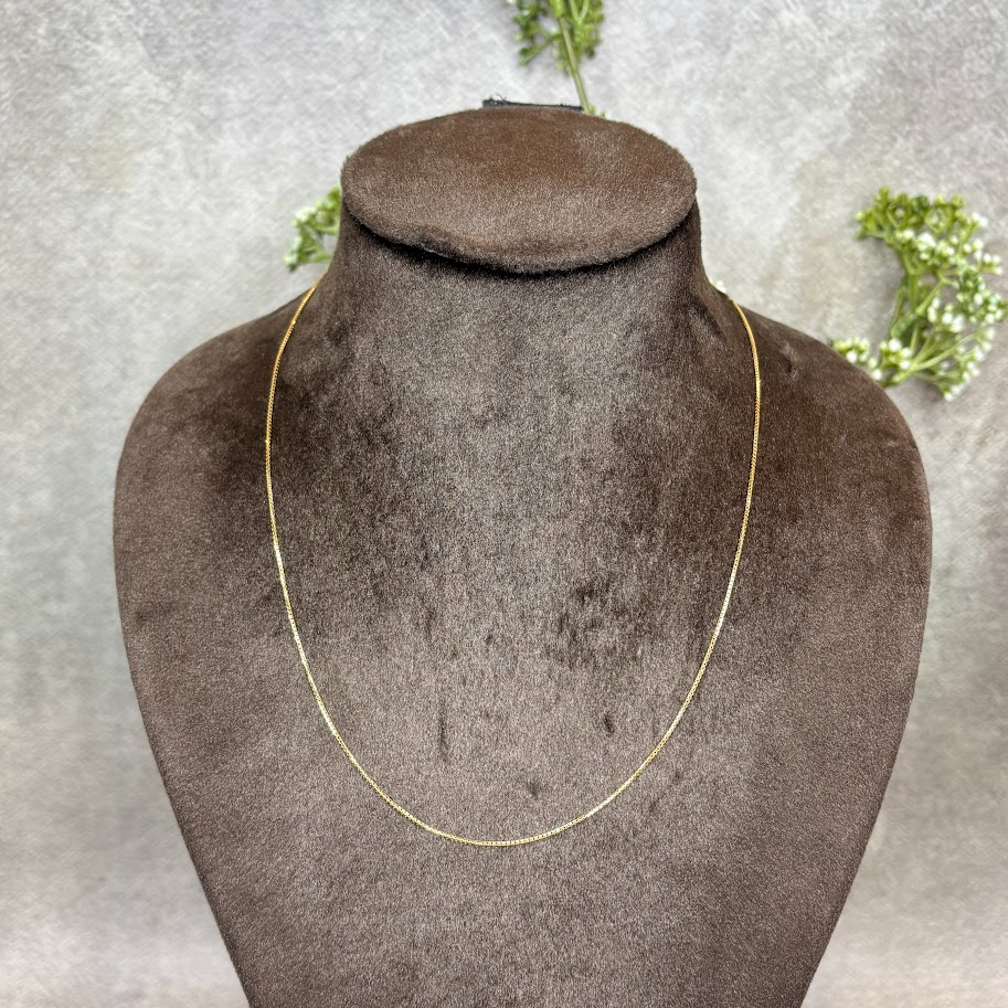This sleek yellow gold box chain features tightly interlocking square links that create a smooth, fluid drape. Its delicate design boasts a brilliant high-polish finish, offering a continuous line of radiance. A timeless and versatile essential for any jewelry collection.