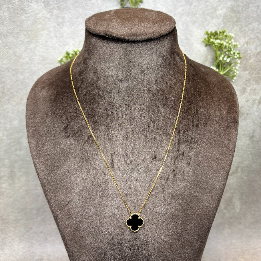 This striking yellow gold necklace highlights a classic four-petal clover pendant with a sleek black onyx inlay. Framed by detailed beaded gold edges, the motif hangs elegantly on a fine chain. A timeless symbol of luck and elegance, offering a bold yet sophisticated contrast.