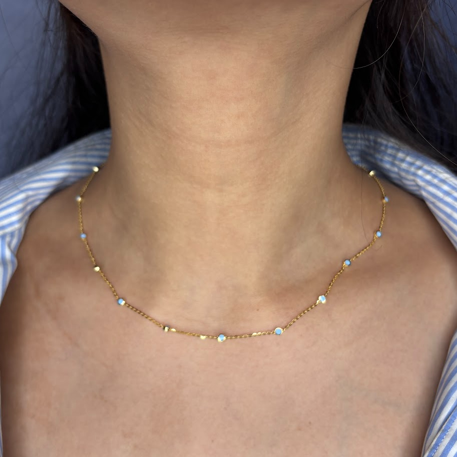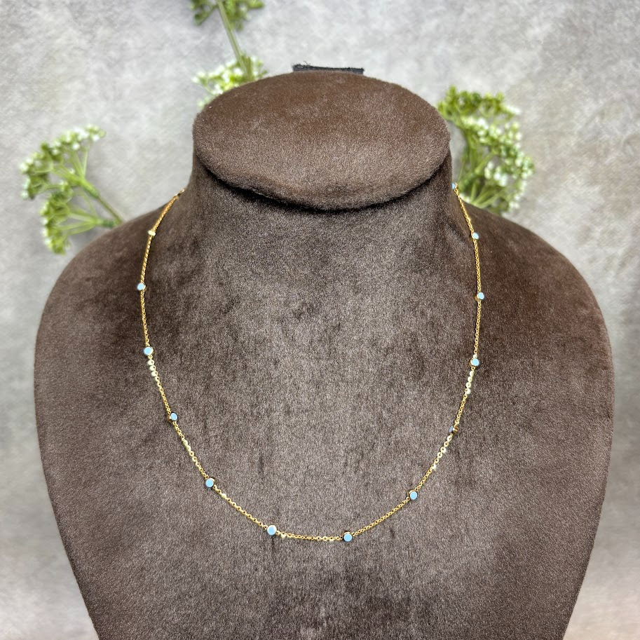 This dainty yellow gold station necklace features vibrant light blue beads spaced gracefully along a fine chain. Interspersed with shimmering faceted gold accents, it offers a refreshing pop of color. A perfect minimalist piece for layering or adding a subtle, playful touch to your daily style.