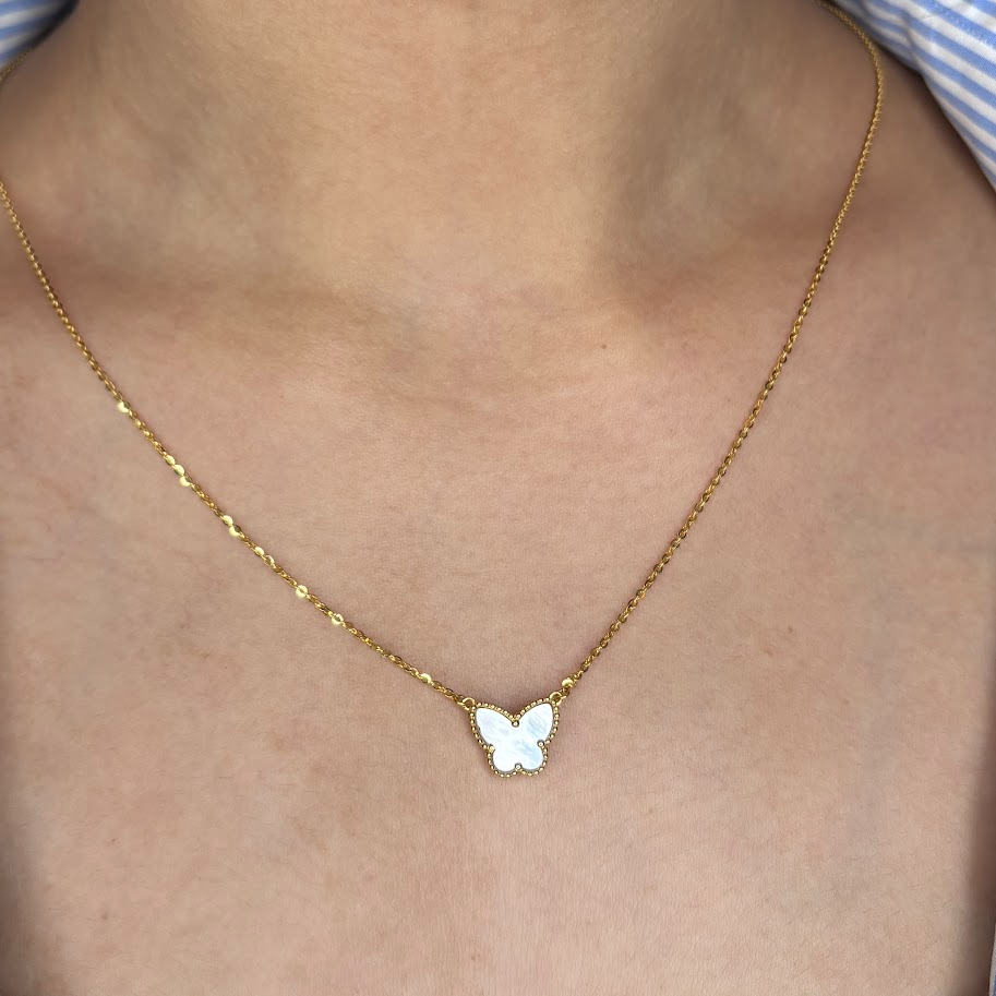 This enchanting yellow gold necklace features a dainty butterfly pendant with a lustrous mother-of-pearl inlay. Framed by intricate beaded gold edges, the motif hangs gracefully on a fine chain. A symbol of transformation and grace, it adds a touch of whimsical elegance to any look.