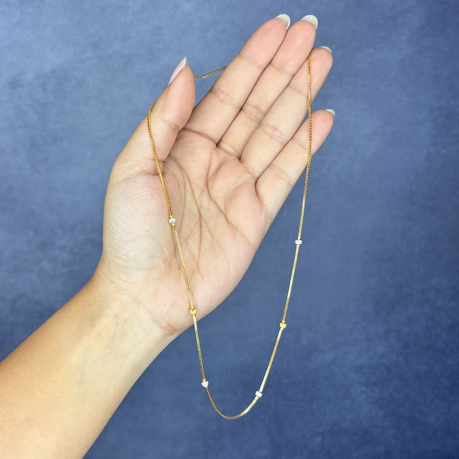 This sleek yellow gold box chain is adorned with delicate stations of sparkling white stones and textured gold accents. The refined design creates a fluid drape with a touch of scattered shimmer. A perfect minimalist piece for layering or adding subtle elegance to any look.