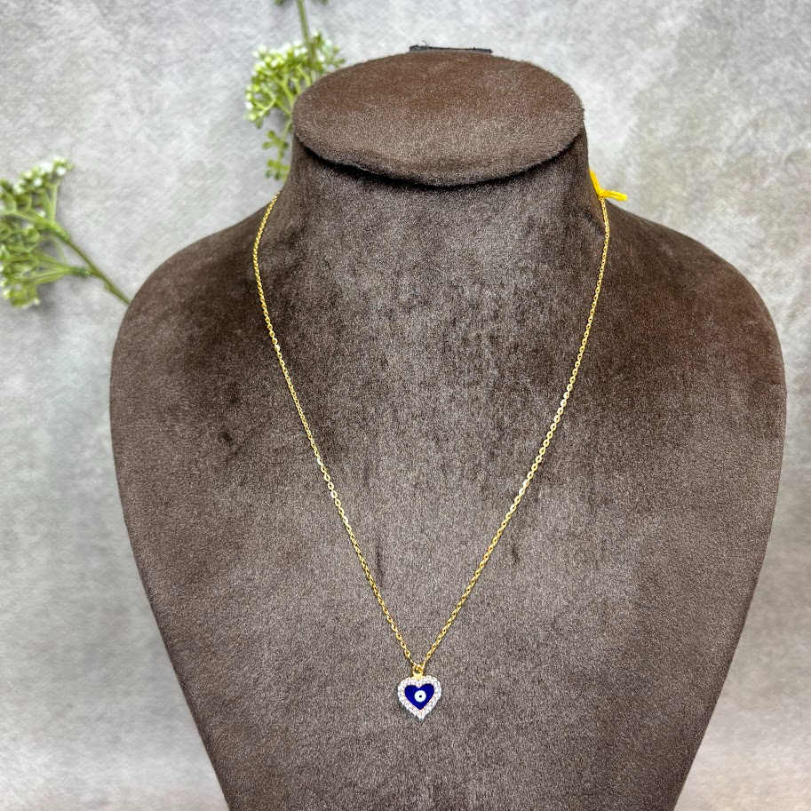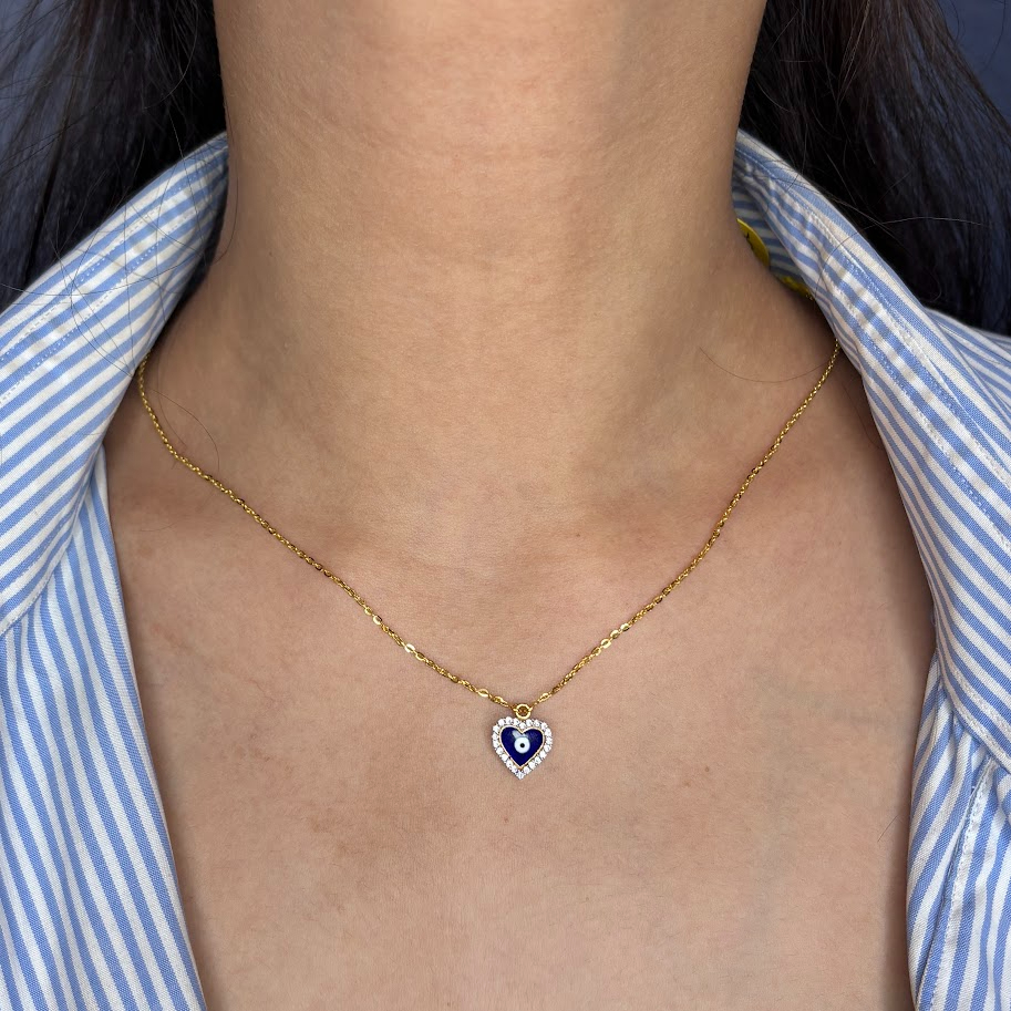 This captivating yellow gold necklace showcases a heart-shaped evil eye pendant. A vibrant deep blue core is framed by a sparkling halo of pave-set stones. Suspended on a fine chain, this protective talisman blends romantic symbolism with elegant sparkle.