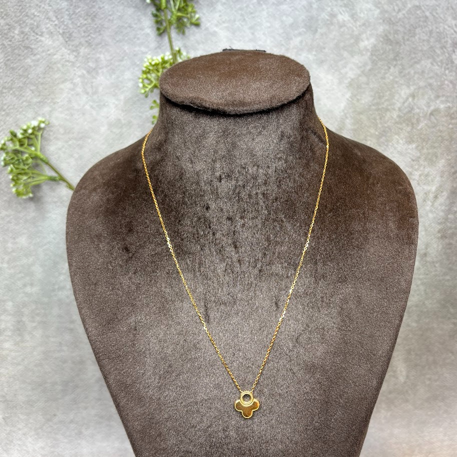 This chic yellow gold necklace features a petite four-leaf clover pendant with a sleek black inlay. Suspended from a textured circular link on a fine chain, this minimalist charm creates a sophisticated symbol of luck and modern elegance.