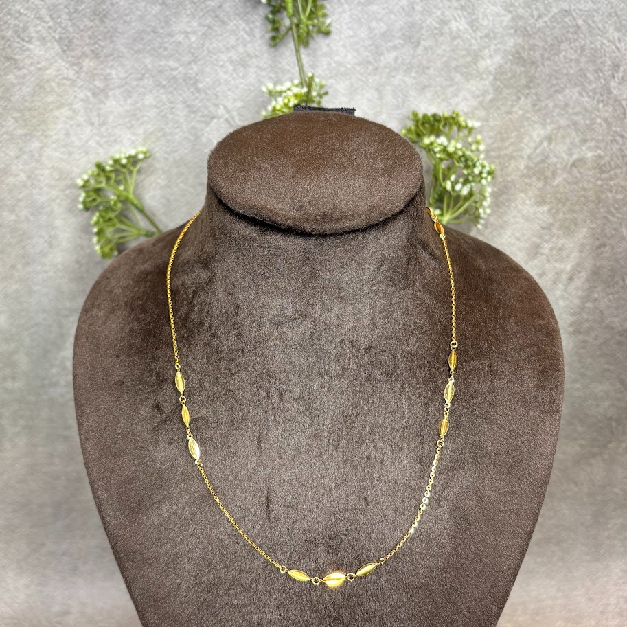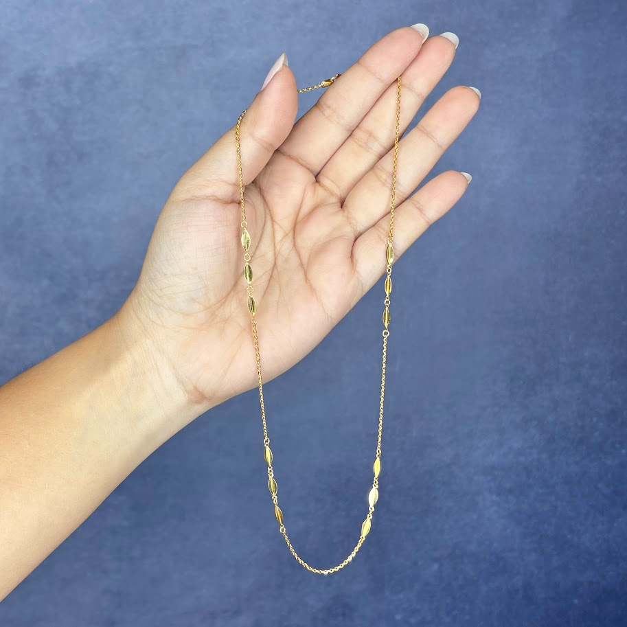 This elegant yellow gold station necklace features smooth, elongated oval beads spaced along a fine chain. The polished gold accents catch the light, adding a sophisticated shimmer. A versatile and timeless piece, perfect for layering or everyday wear.