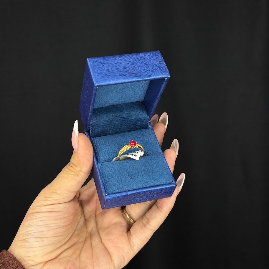 This captivating gold ring features a bold, round red gemstone. The band distinguishes itself with intricate texturing along the shank, adding detailed craftsmanship to the design. A perfect blend of vibrant color and classic gold elegance, ideal for making a subtle statement.