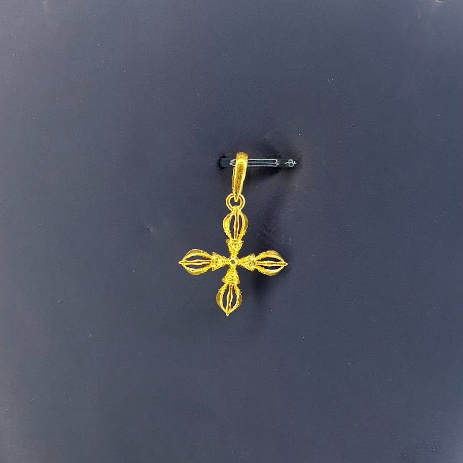 An intricately crafted yellow gold pendant featuring the Double Vajra (Vishvavajra) symbol. This four-armed spiritual design showcases detailed, ribbed prongs radiating from a central sphere. A sacred emblem of stability and protection, it is finished with a polished bail.