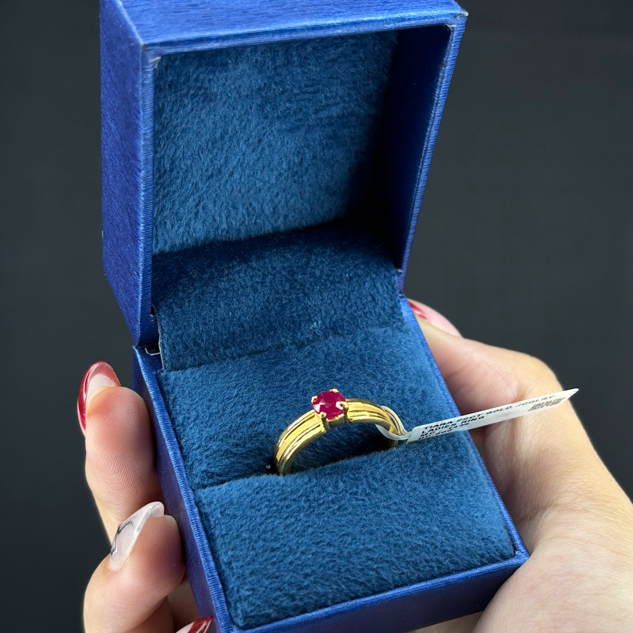 This bold gold ring centers a vivid red gemstone. The wide band features distinct horizontal grooves, adding a modern, linear texture to the classic solitaire look. A structured and contemporary design, perfect for those who appreciate detailed craftsmanship.