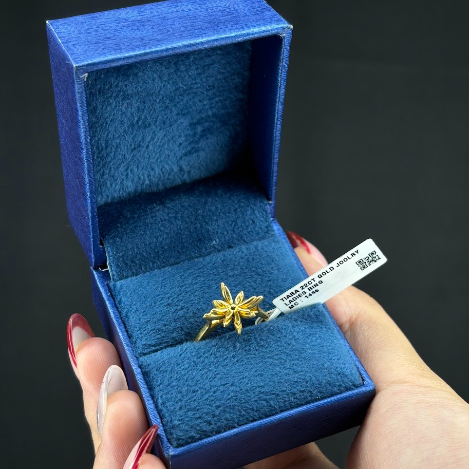 This radiant gold ring highlights a striking starburst motif. With pointed rays diverging from the center, it resembles a shining sun. Set on a slender polished band, this celestial-inspired design offers a modern, playful look. A perfect way to add unique shine to your daily style.