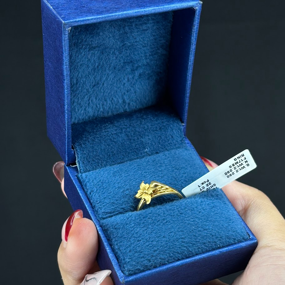This charming gold ring features a sculpted floral motif with layered petals resembling a blooming flower. Set on a slender, polished band, the design is both delicate and dimensional. A graceful nature-inspired piece, ideal for adding a touch of feminine elegance to your everyday style.