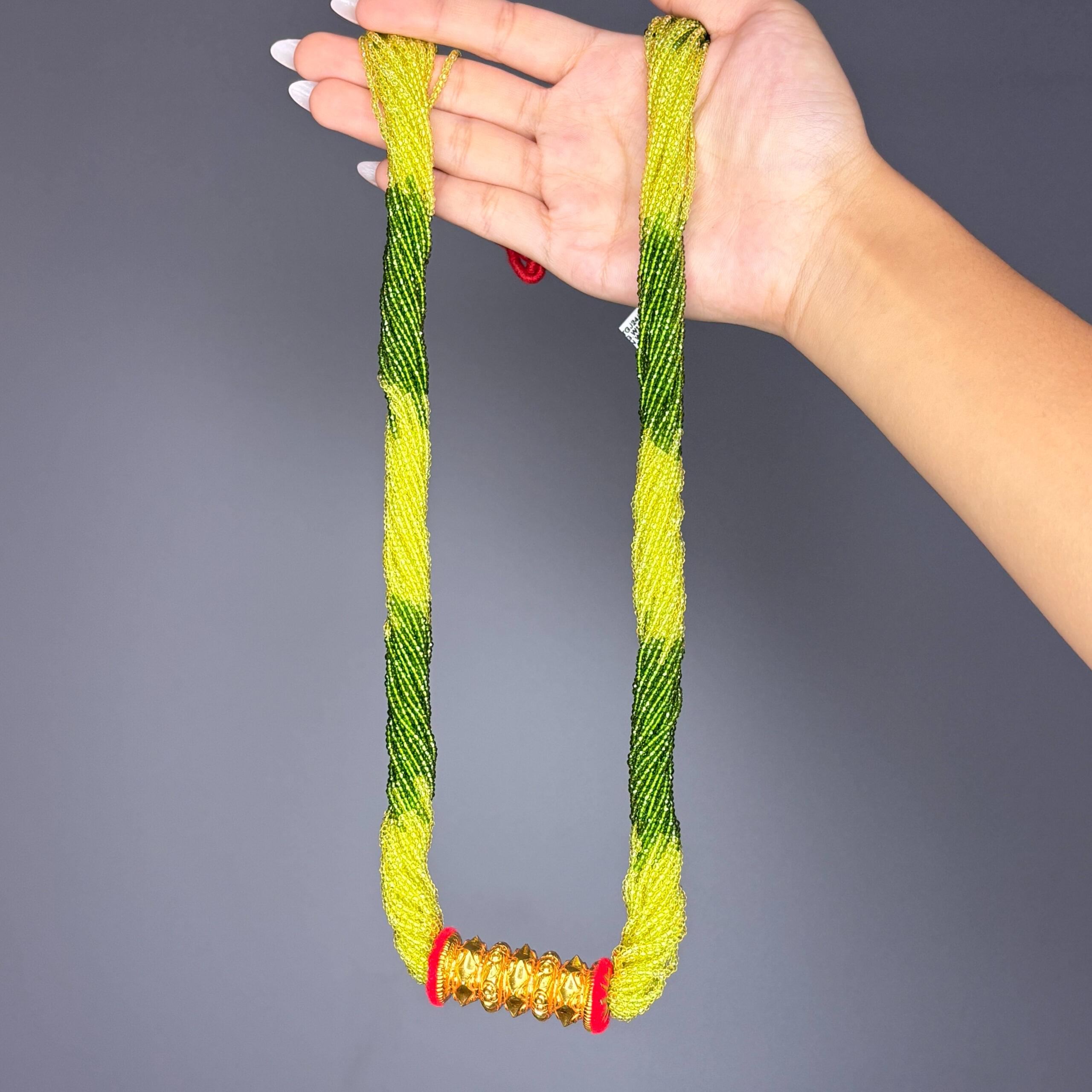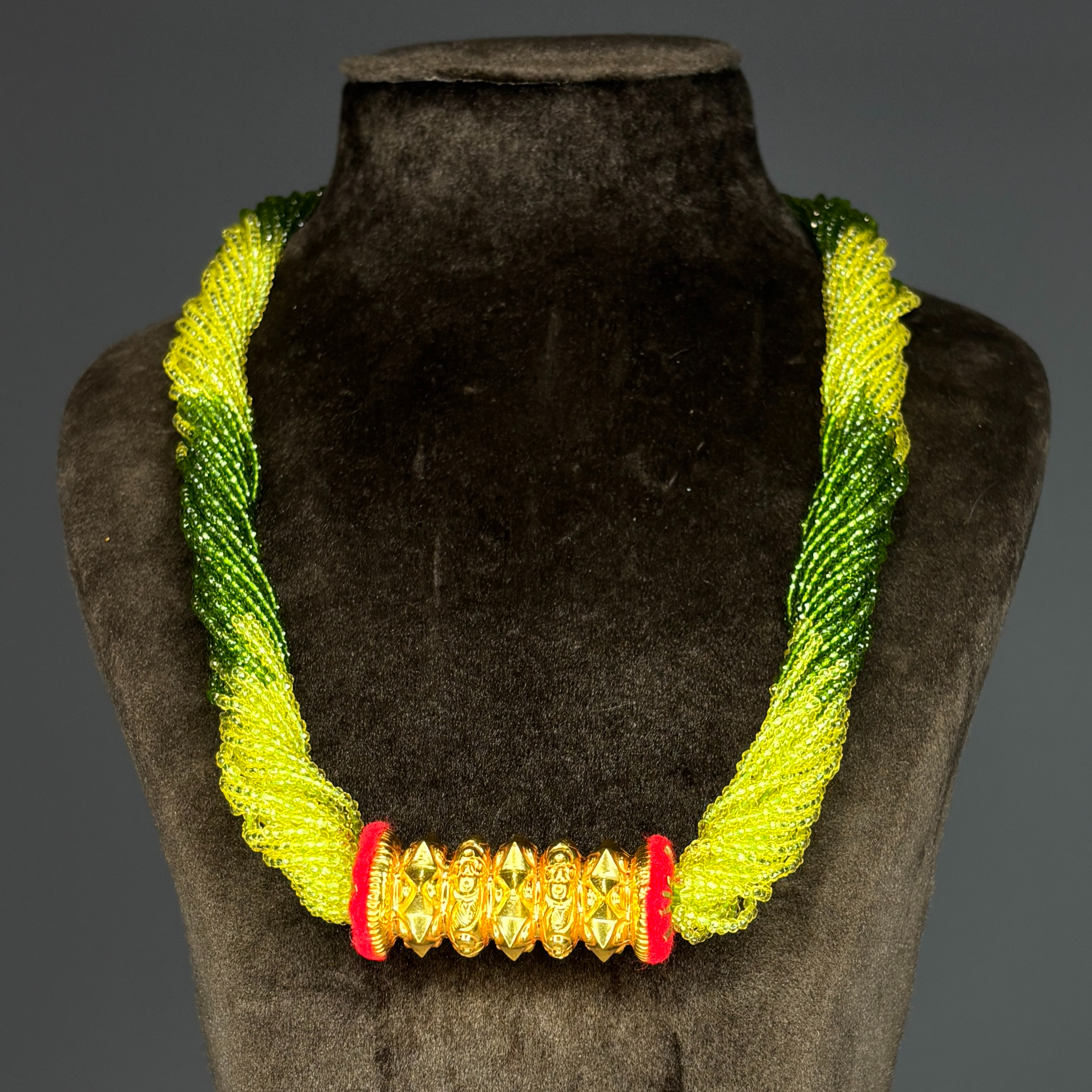 This is a close-up of a vibrant traditional joolry item, it has high-purity 24 KT gold for its metal elements. The piece features a decorative drop made of sparkling GREEN faceted beads. It is a single, ornate traditional piece.