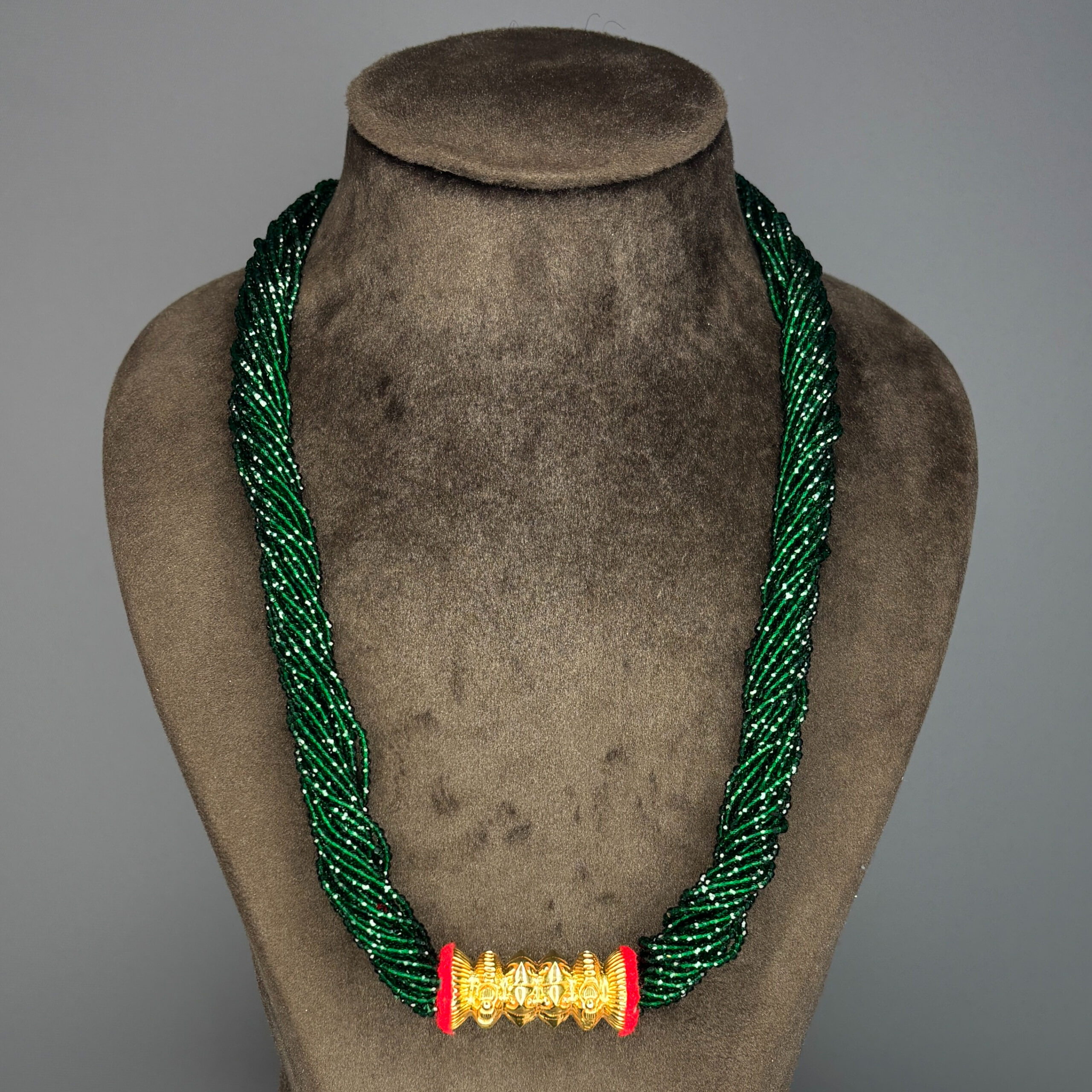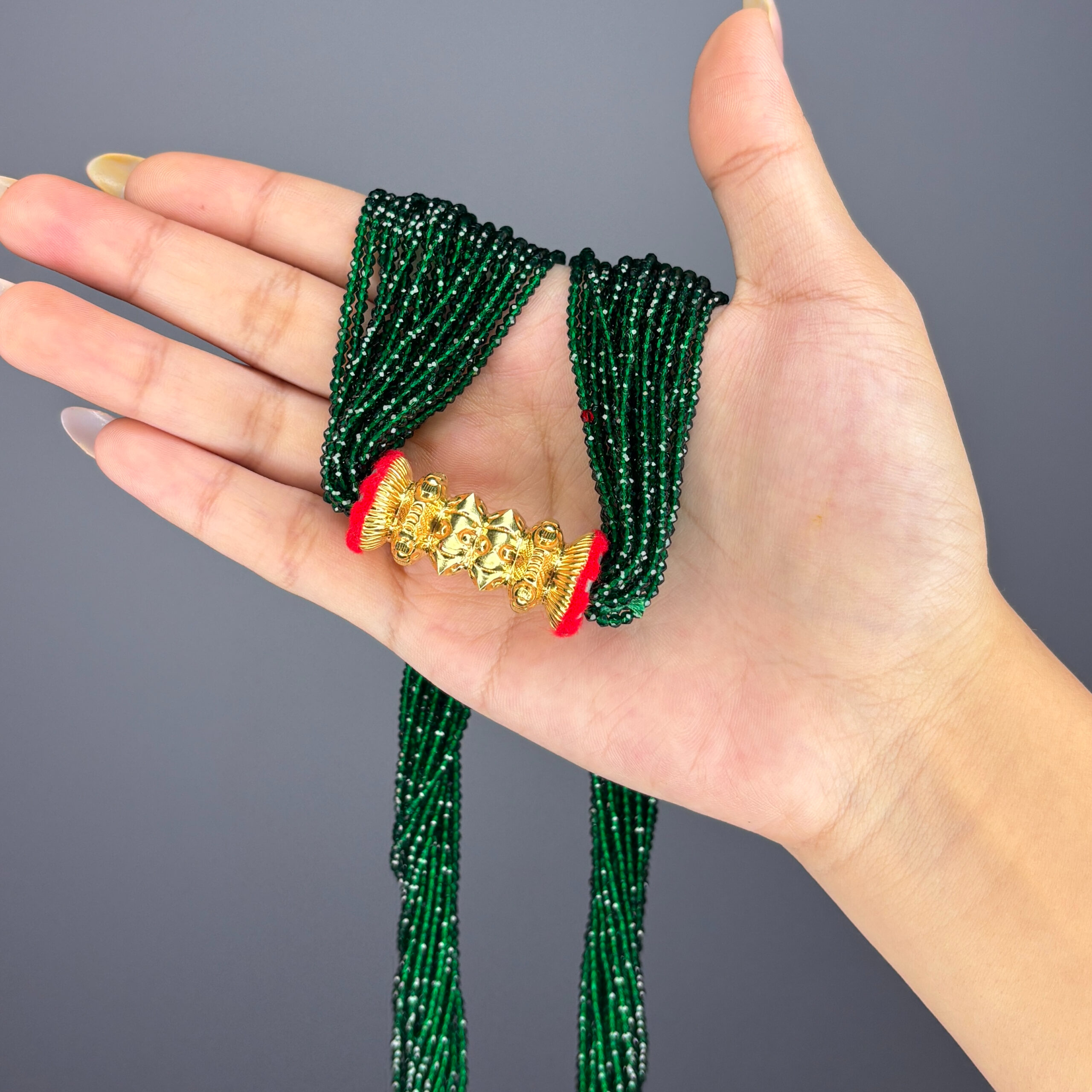 Experience royal elegance with our Crystal Tilhari. Cascading Green crystal Tilhari are accented 24KT gold spacers. This lightweight masterpiece blends traditional design with timeless style, making it a captivating statement piece for any grand occasion.