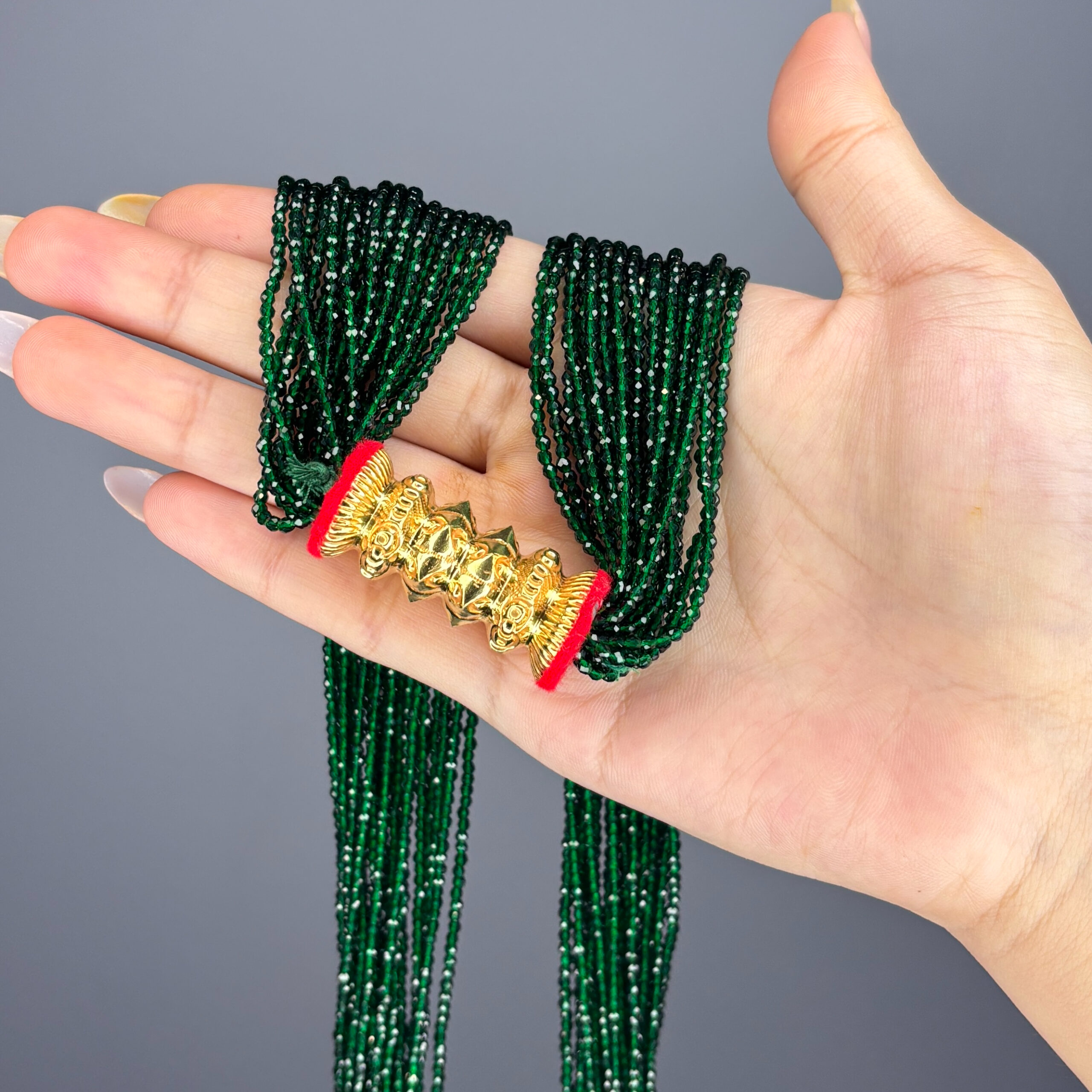 Experience royal elegance with our Crystal Tilhari. Cascading Green crystal Tilhari are accented 24KT gold spacers. This lightweight masterpiece blends traditional design with timeless style, making it a captivating statement piece for any grand occasion.